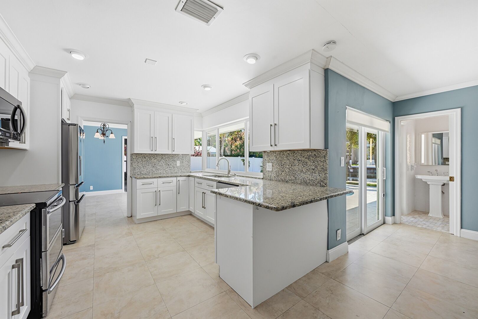 Baseboards Wall, Ceiling Fan, Crown Molding, Crown Molding Cabinets, Drywall, G Shaped Kitchen, Kitchen Bar, Kitchen Peninsula, Natural Light, Opens To Living Area, Recessed Lighting, Shaker Cabinets, Smoke Carbon Monoxide Detector, Stone Countertops, Tile Floor, Vent, Baseboards Wall, Crown Molding Cabinets, Natural Light, Tile Floor