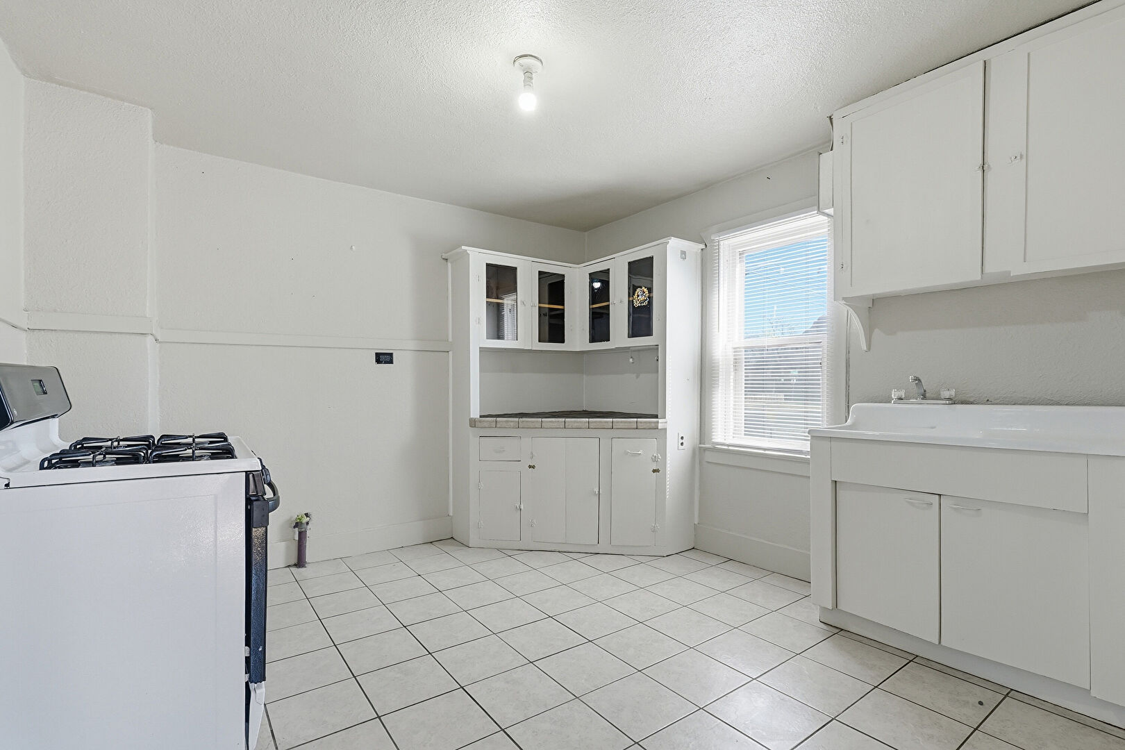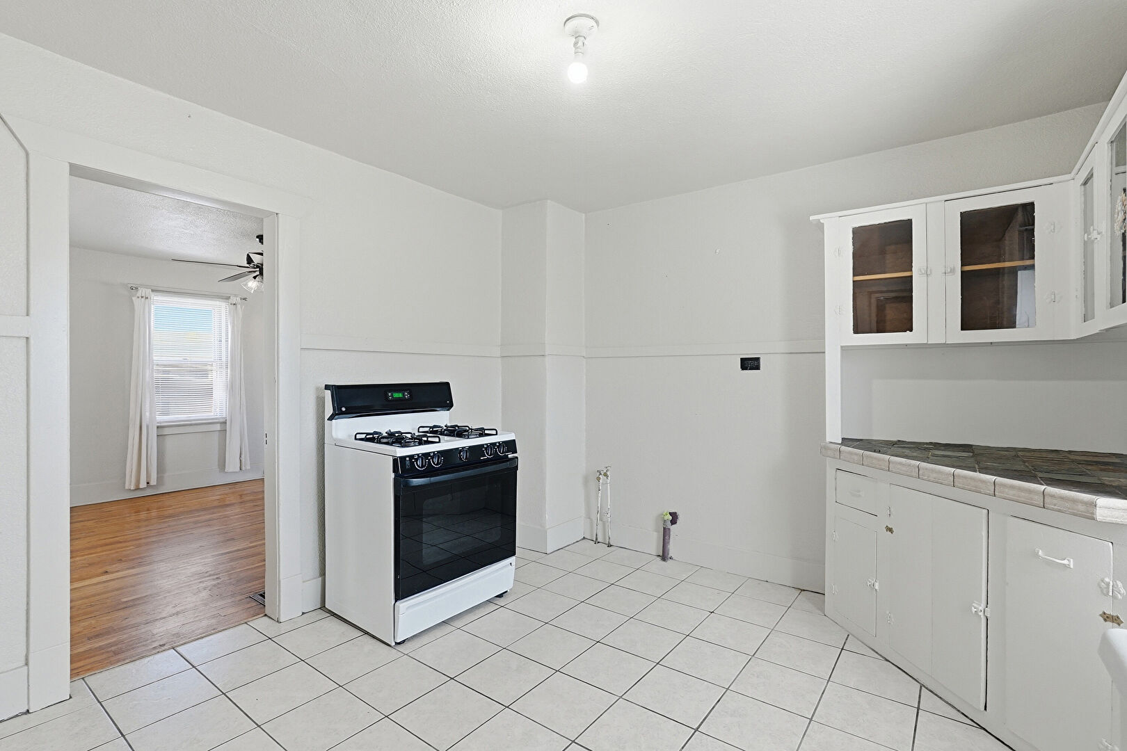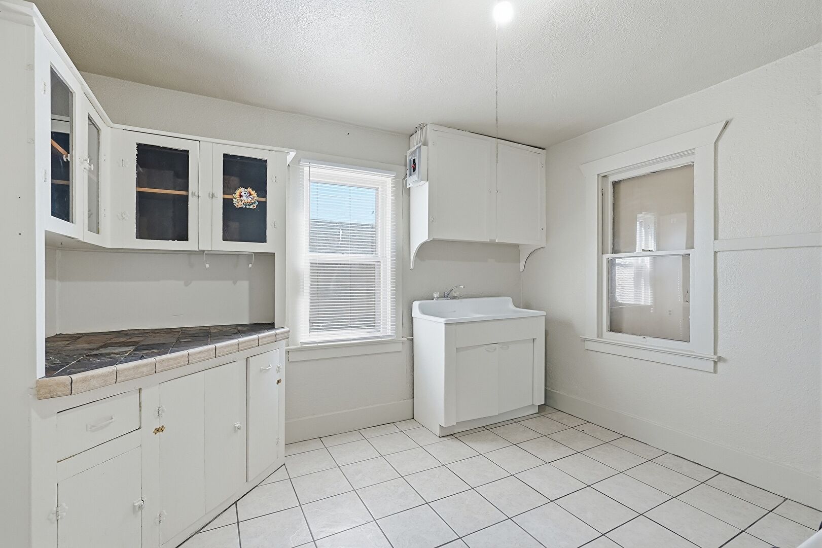 Baseboards Wall, Ceiling Fan, Crown Molding Cabinets, Drywall, Glass Insert Cabinets, Natural Light, Textured Ceiling, Tile Countertops, Tile Floor, Visible Hinge Cabinets, Natural Light, Visible Hinge Cabinets