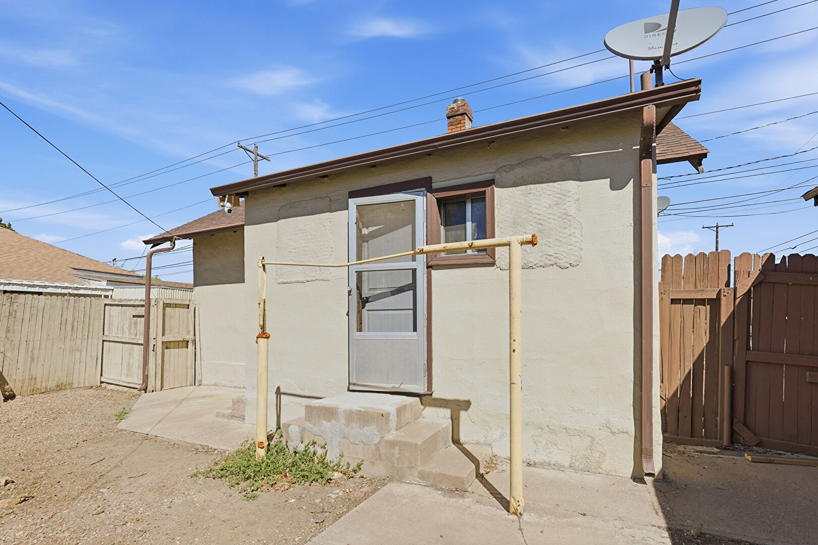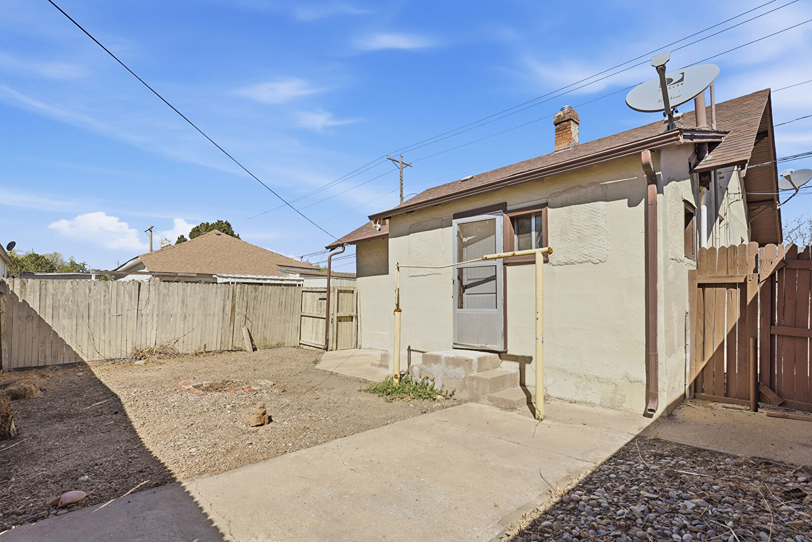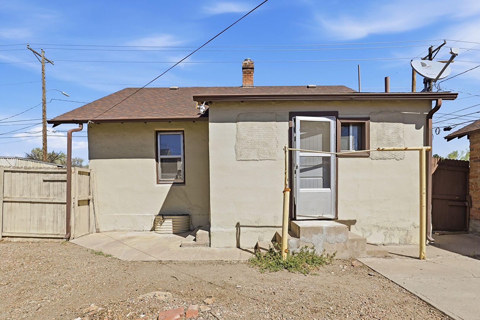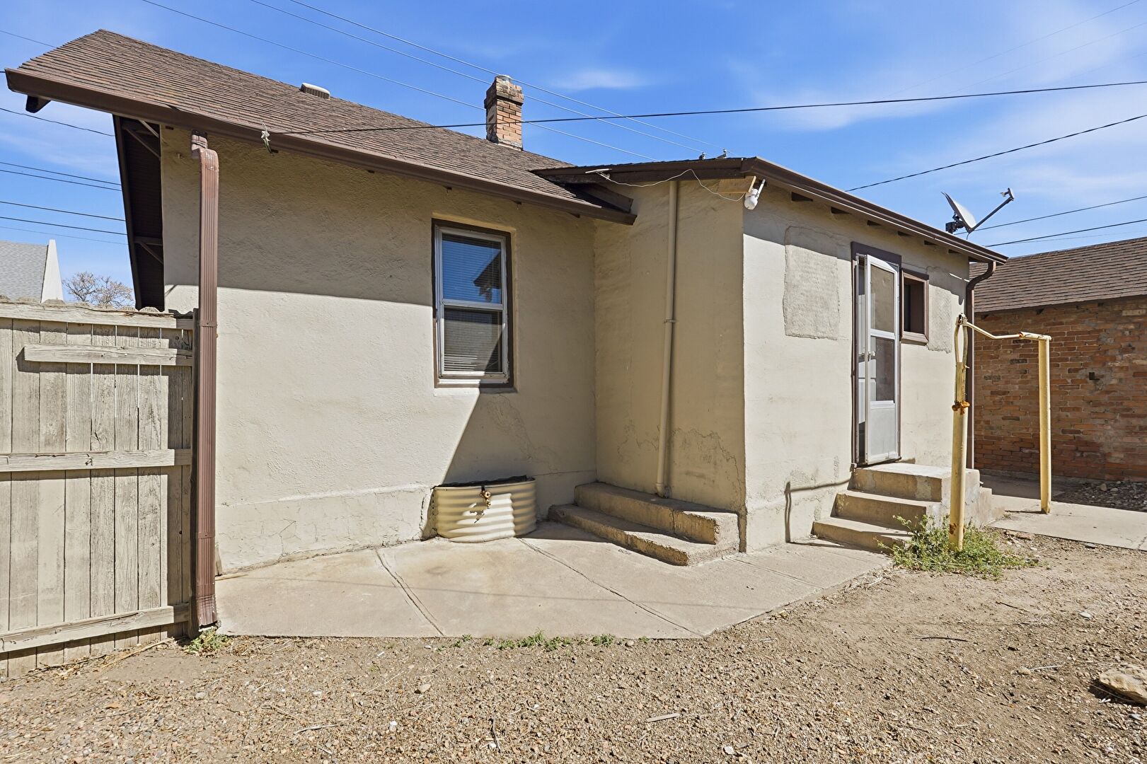 Chimney, Downspout, Entry Steps, Fence, Gate, Gutters, Satellite Dish, Shingle Roof, Stoop, Stucco Siding, Entry Steps, Fence, Satellite Dish, Stucco Siding