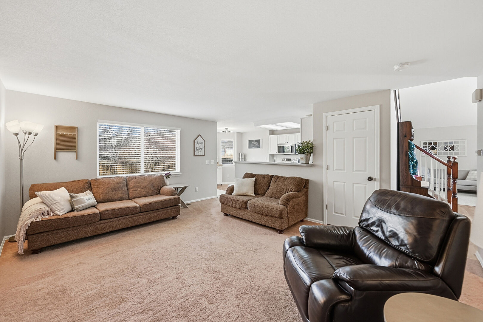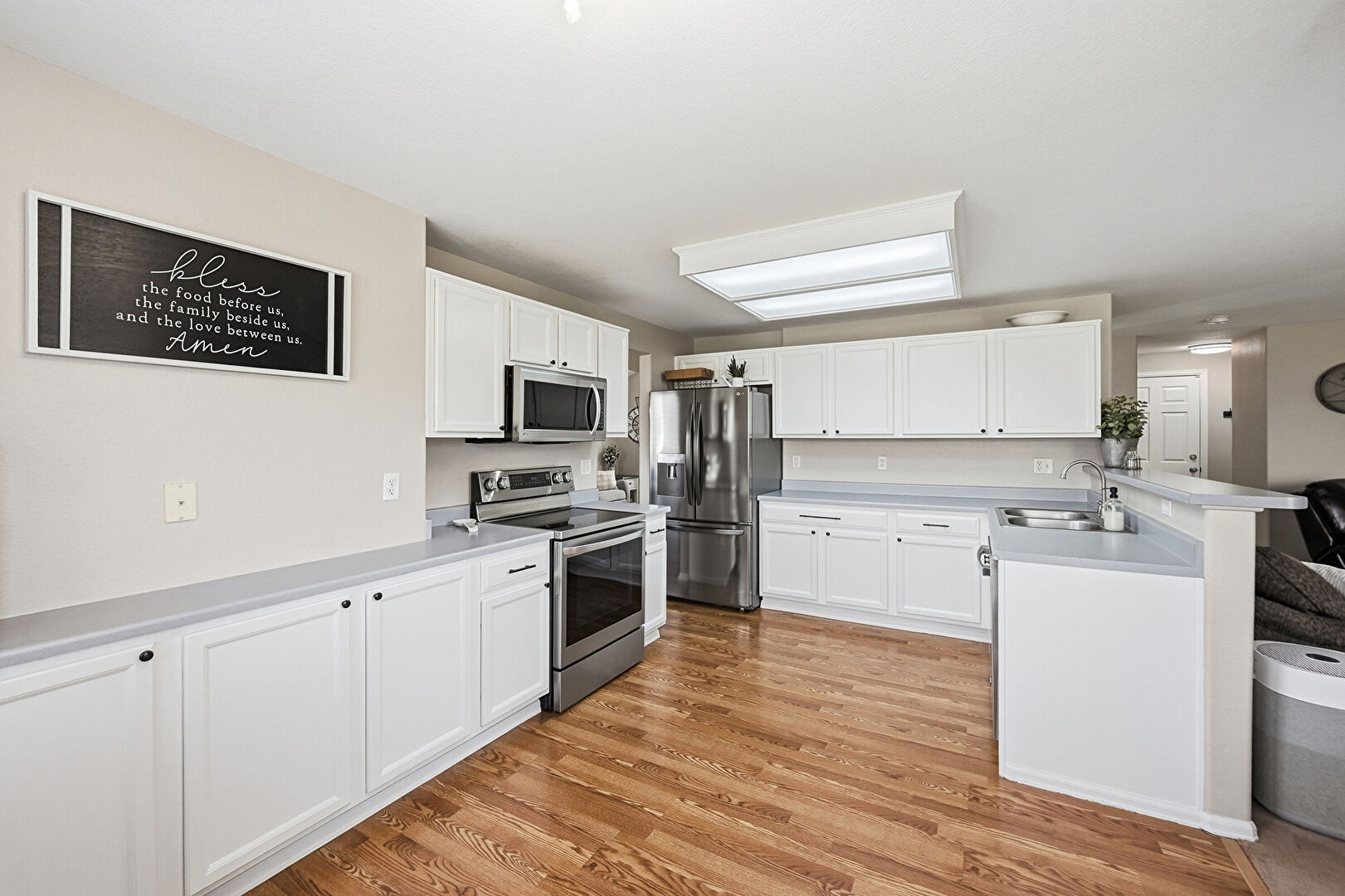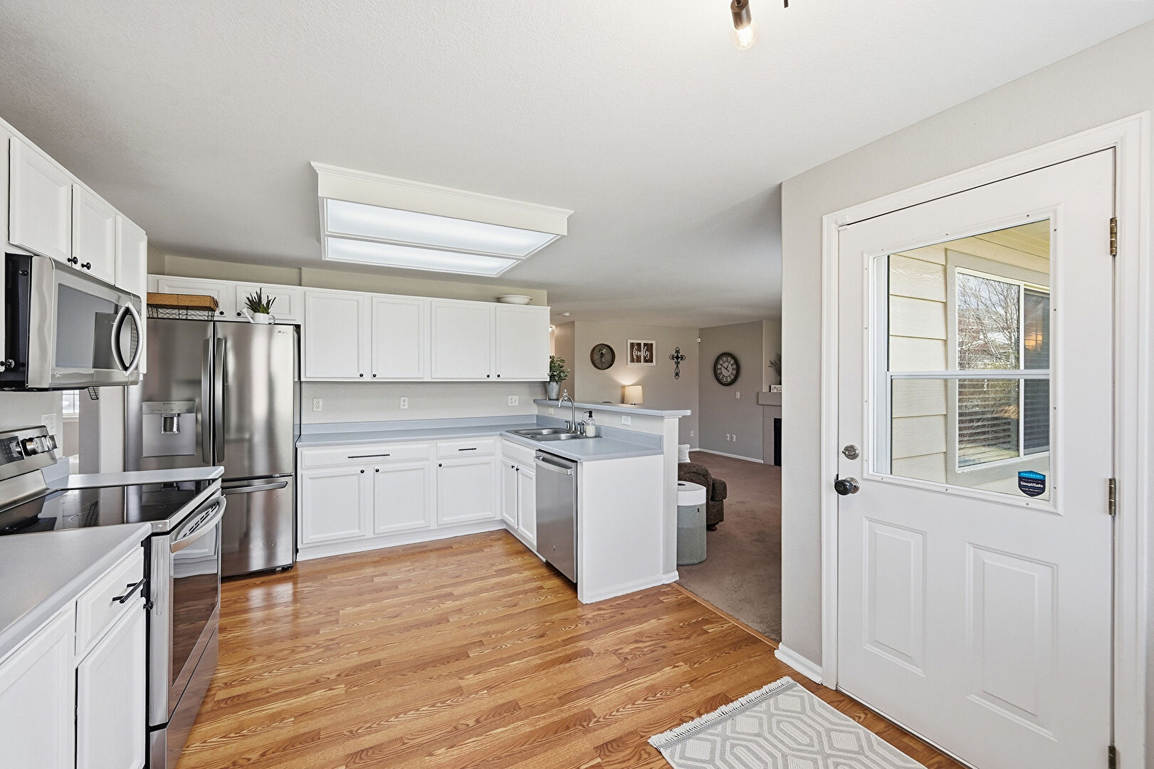 Baseboards Wall, Carpet, Drywall, Kitchen Bar, Kitchen Peninsula, Natural Light, Opens To Living Area, Shaker Cabinets, U Shaped Kitchen, Wood Finish Floor, Kitchen Peninsula, Natural Light, Opens To Living Area, Shaker Cabinets, U Shaped Kitchen