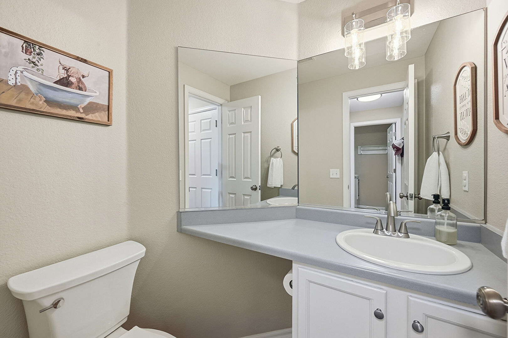 Combined Bath Shower, Drywall, Full Bathroom, Natural Light, Textured Wall, Vanity, Wood Finish Floor, Half Bathroom, Vanity