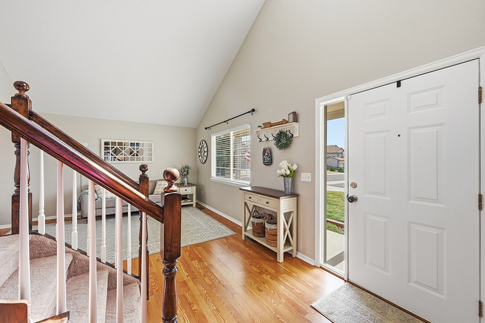 Baseboards Wall, Drywall, High Ceiling, Natural Light, Vaulted Ceiling, Wood Finish Floor, Stairs