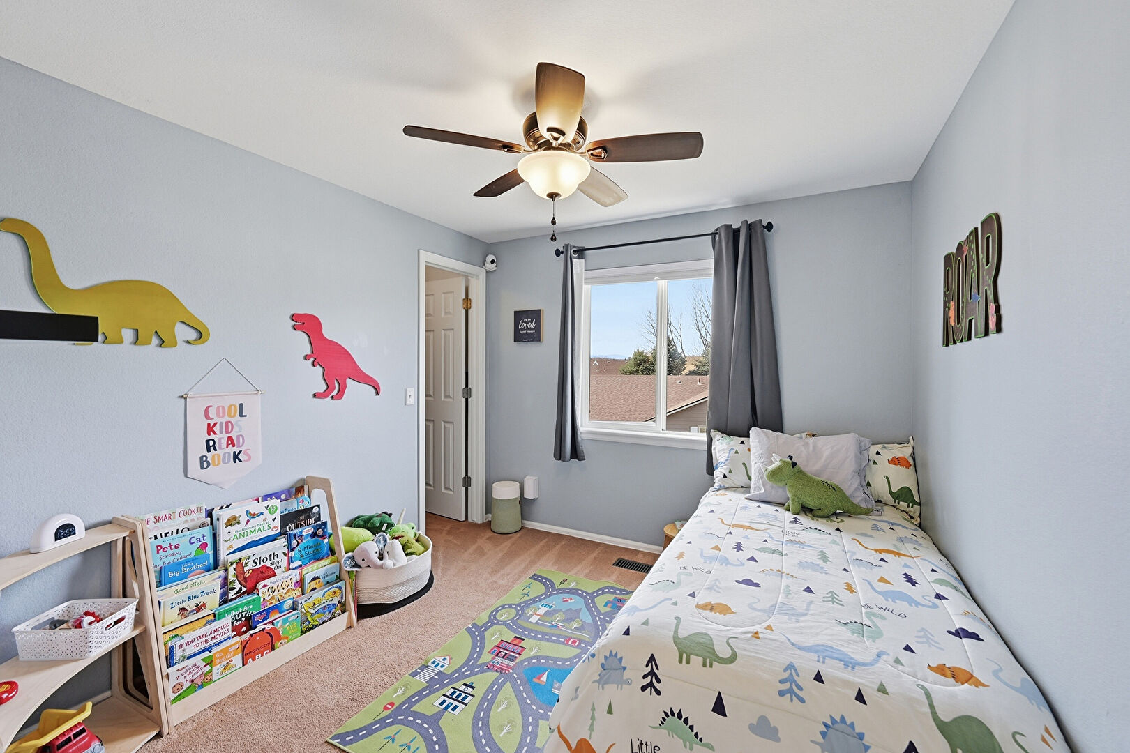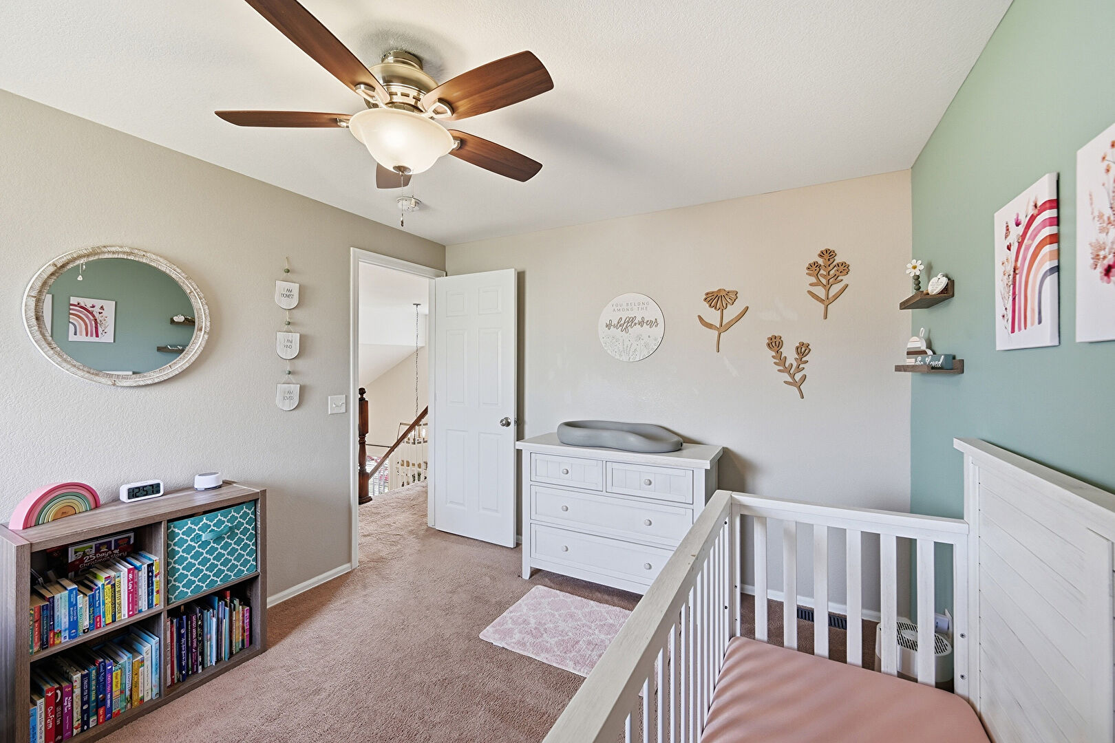 Baseboards Wall, Carpet, Ceiling Fan, Closet, Drywall, Natural Light, Nursery, Office Area, Vent, Baseboards Wall, Carpet, Ceiling Fan, Natural Light, Nursery