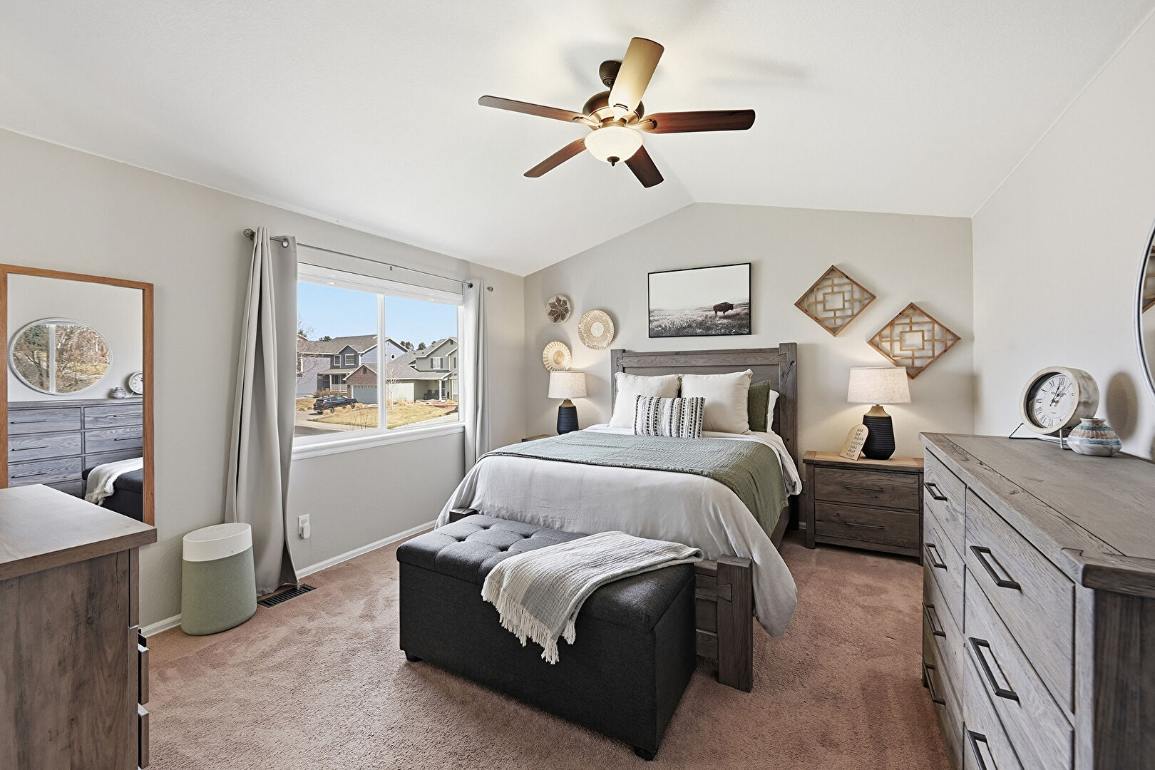 Baseboards Wall, Carpet, Ceiling Fan, Drywall, Natural Light, Vaulted Ceiling, Carpet, Cathedral Ceiling