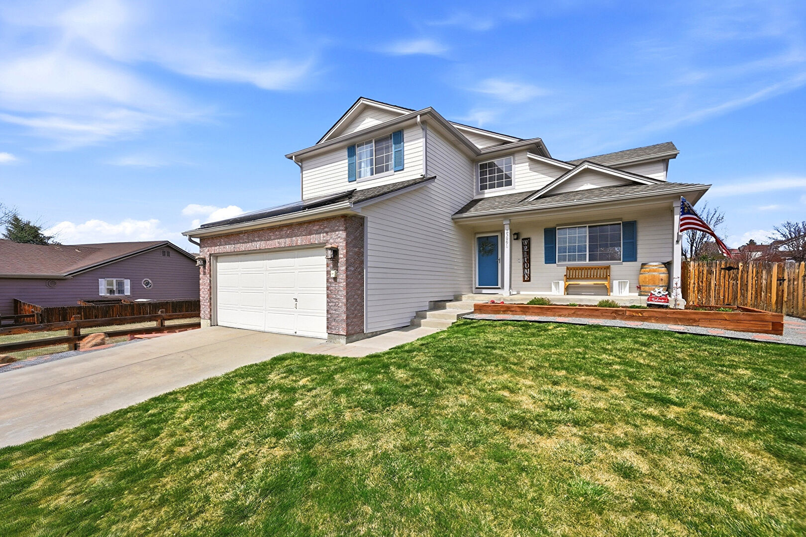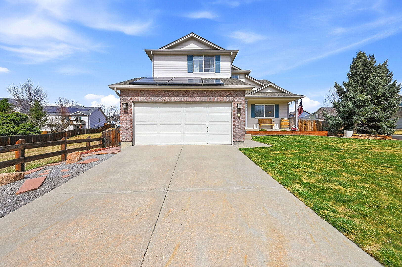 Brick Siding, Built In Garage, Concrete Foundation, Downspout, Driveway, Fence, Garage, Gutters, Horizontal Siding, Lawn, Porch, Residential View, Shingle Roof, Solar Panels, Fence, Lawn, Porch