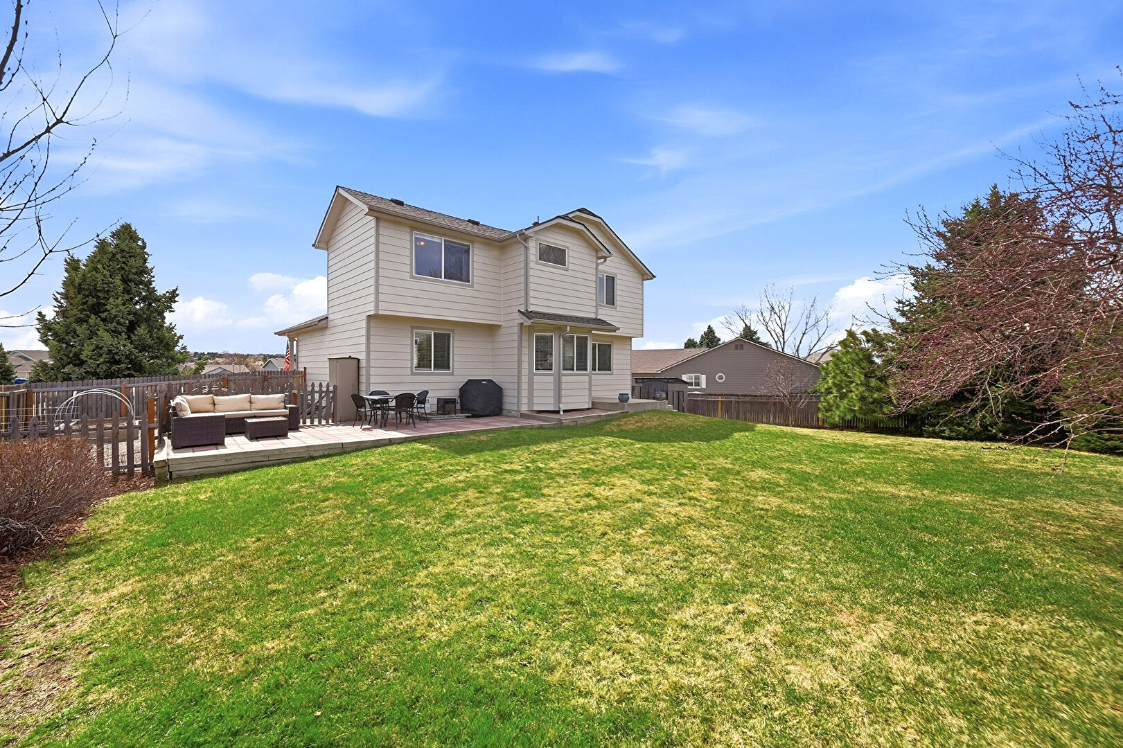 Concrete Foundation, Deck, Downspout, Fence, Grill, Gutters, Horizontal Siding, Lawn, Outdoor Living Space, Outdoor Structure, Patio, Residential View, Shed, Horizontal Siding, Lawn