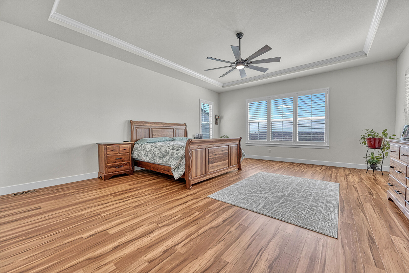 Baseboards Wall, Ceiling Fan, Crown Molding, Drywall, Natural Light, Tray Ceiling, Vent, Wood Finish Floor, Ceiling Fan, Natural Light