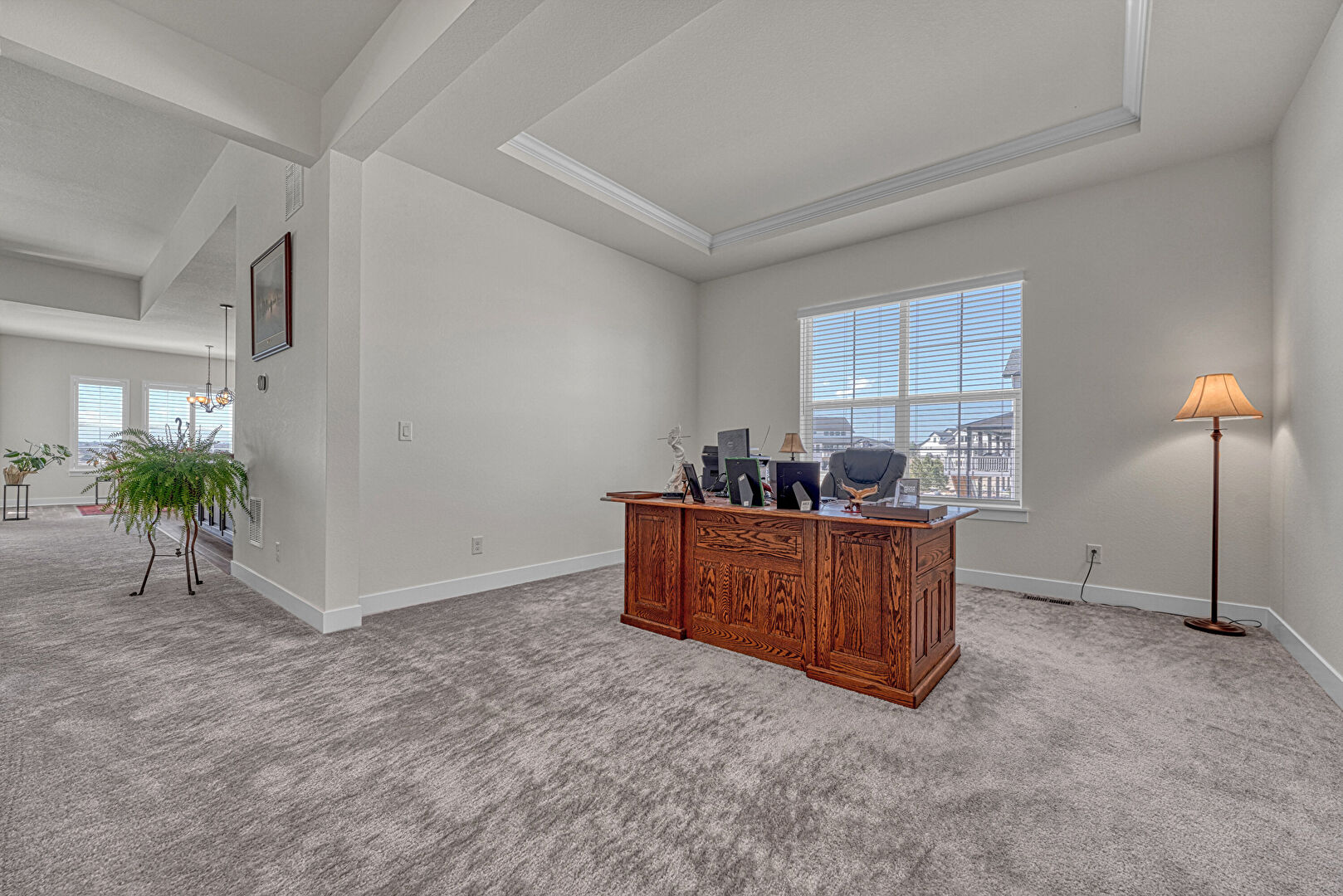 Baseboards Wall, Carpet, Crown Molding, Drywall, Natural Light, Notable Chandelier, Tray Ceiling, Vent, Office Area