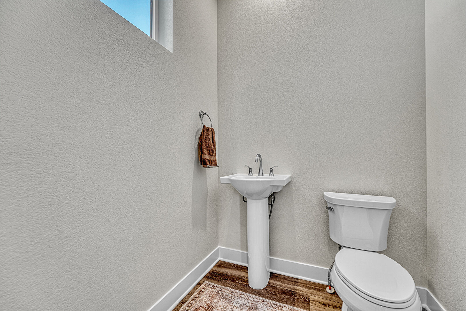 Baseboards Wall, Half Bathroom, Natural Light, Recessed Lighting, Textured Wall, Vanity, Wood Finish Floor, Full Bathroom, Textured Wall