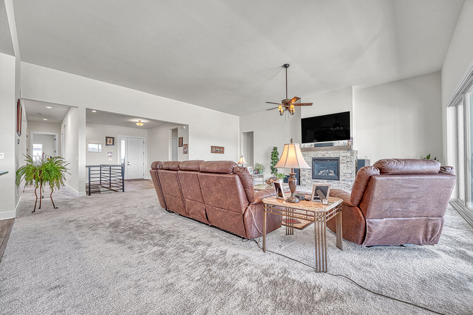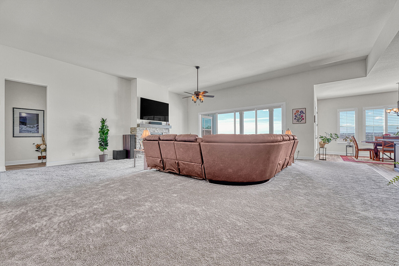 Baseboards Wall, Carpet, Ceiling Fan, Double Oven, Drywall, Natural Light, Notable Chandelier, Recessed Lighting, Vent, Baseboards Wall, Carpet, Fireplace