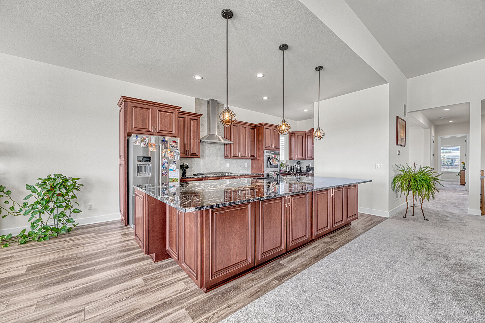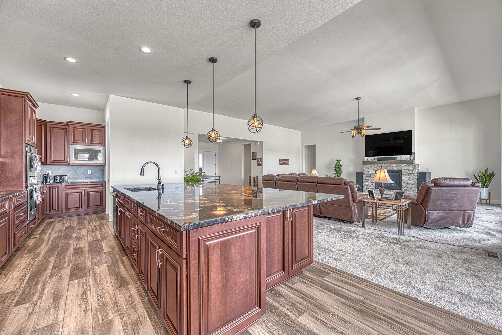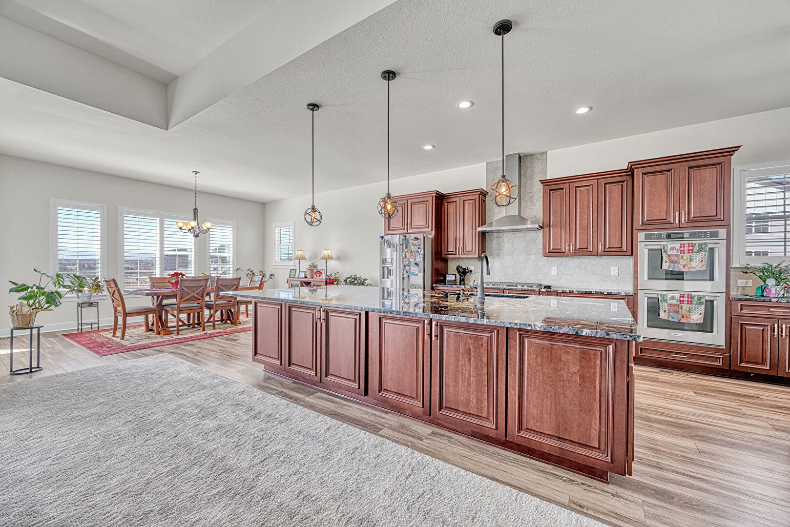 Baseboards Wall, Ceiling Fan, Crown Molding Cabinets, Double Oven, Drywall, Fireplace, Kitchen Island, Medium Brown Cabinets, Natural Light, One Wall Kitchen, Opens To Living Area, Pendant Lighting, Raised Cabinets, Recessed Lighting, Stone Countertops, Textured Ceiling, Vaulted Ceiling, Wood Finish Floor, Double Oven, Notable Chandelier, Wood Finish Floor