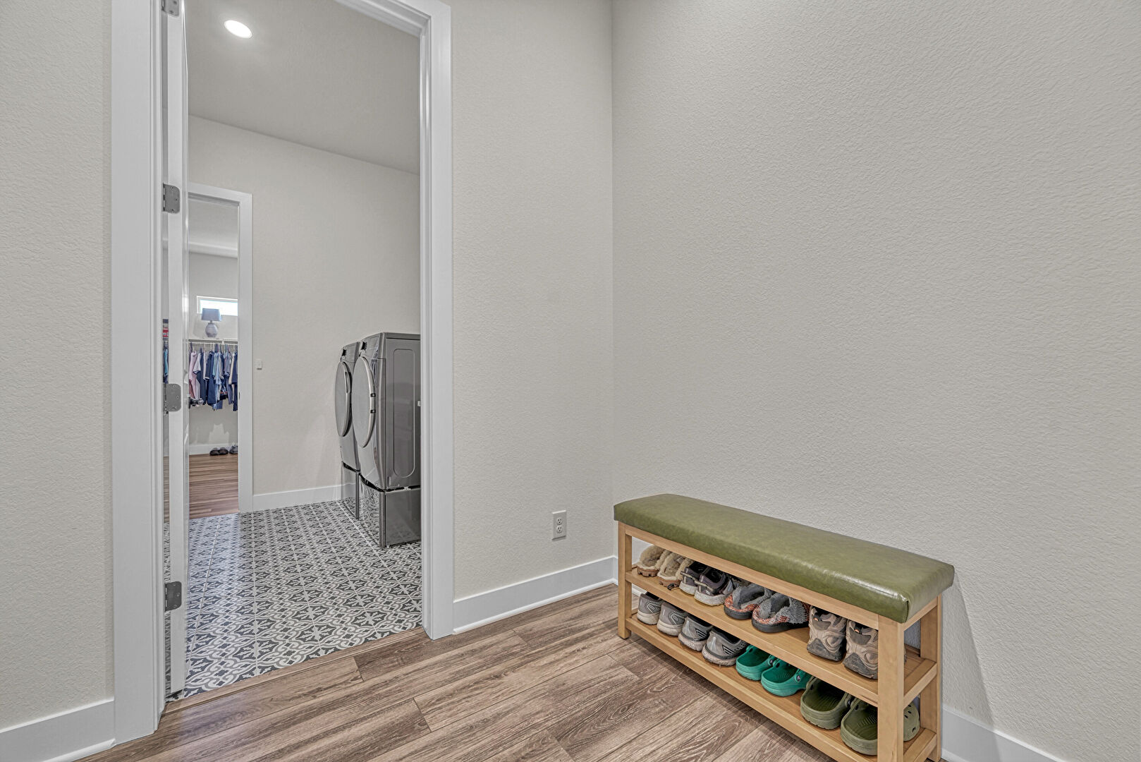 Laundry, Recessed Lighting, Textured Wall, Wood Finish Floor, Baseboards Wall