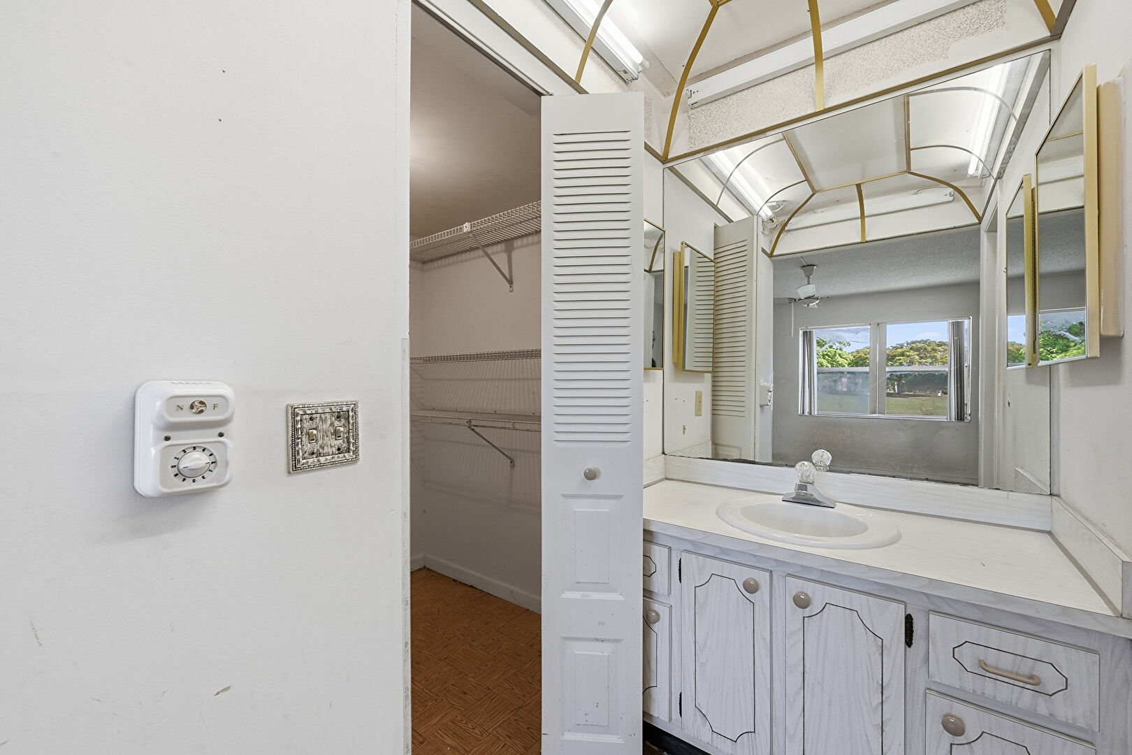 Baseboards Wall, Combined Bath Shower, Drywall, Full Bathroom, Tile Floor, Vanity, Walk In Closet, Wood Finish Floor, Full Bathroom, Natural Light, Tile Wall