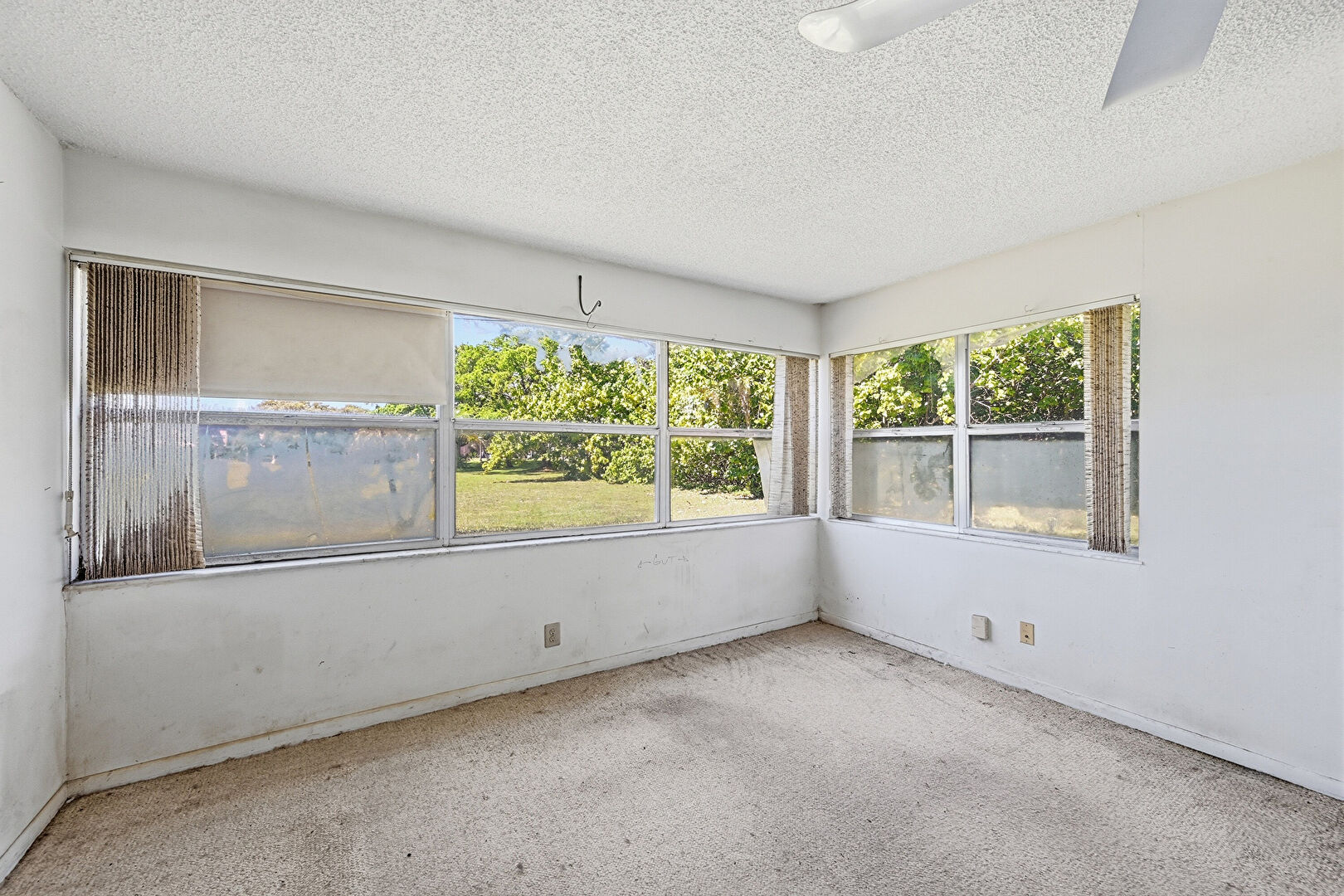 Baseboards Wall, Carpet, Ceiling Fan, Drywall, Natural Light, Sunroom, Textured Ceiling, Vent, Drywall, Textured Ceiling