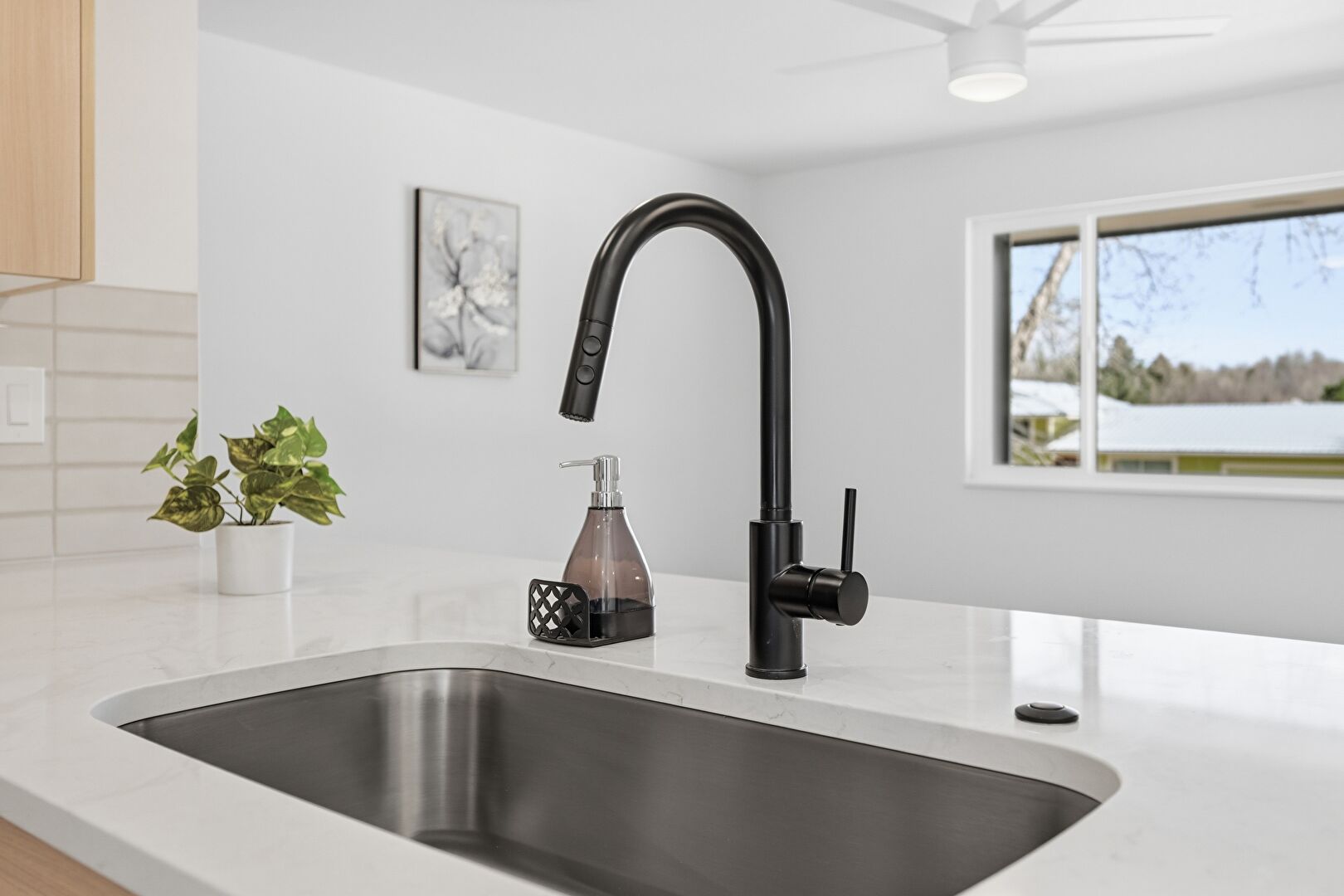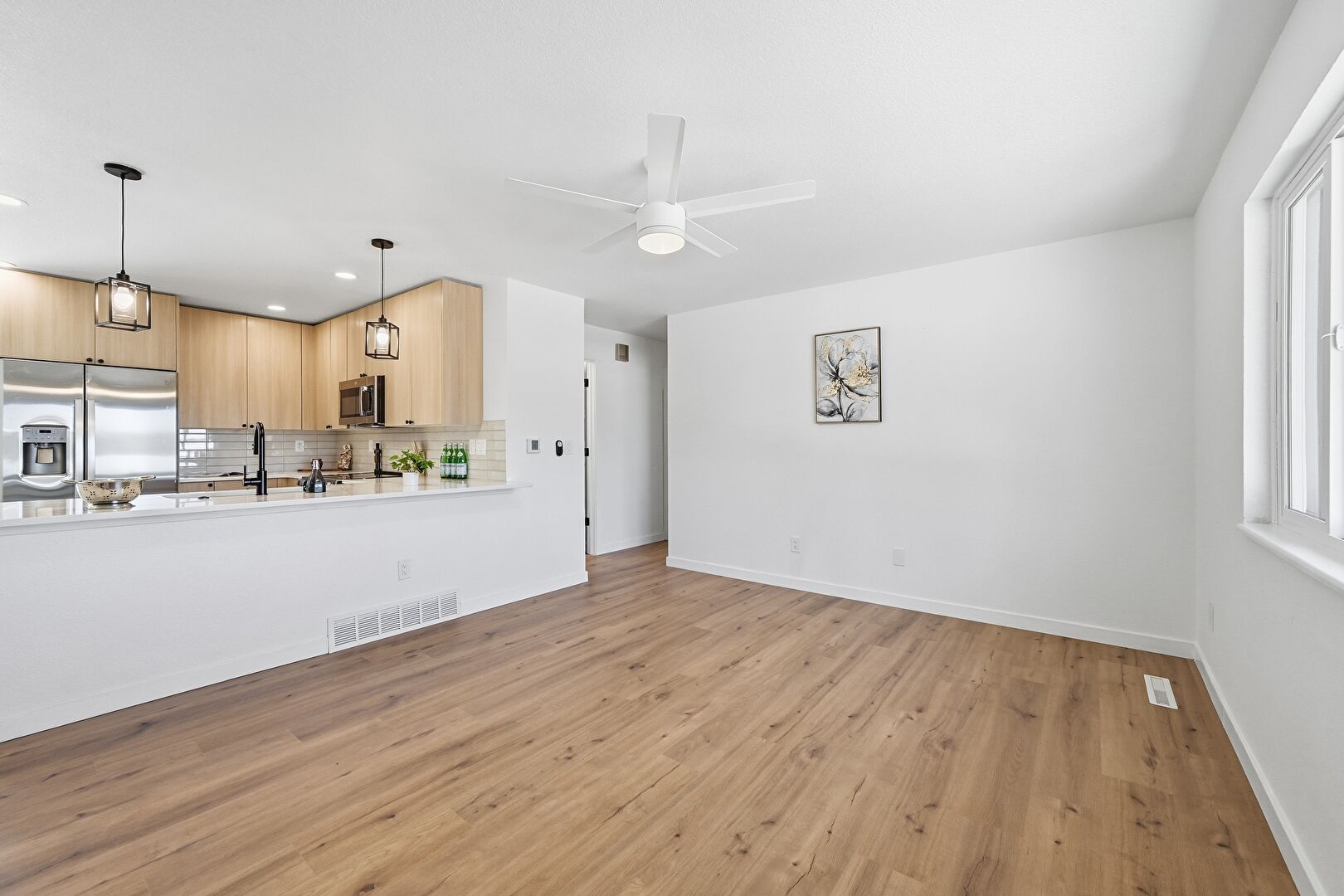 Baseboards Wall, Ceiling Fan, Drywall, Natural Light, Recessed Lighting, U Shaped Kitchen, Vent, Wood Finish Floor, Baseboards Wall, Ceiling Fan
