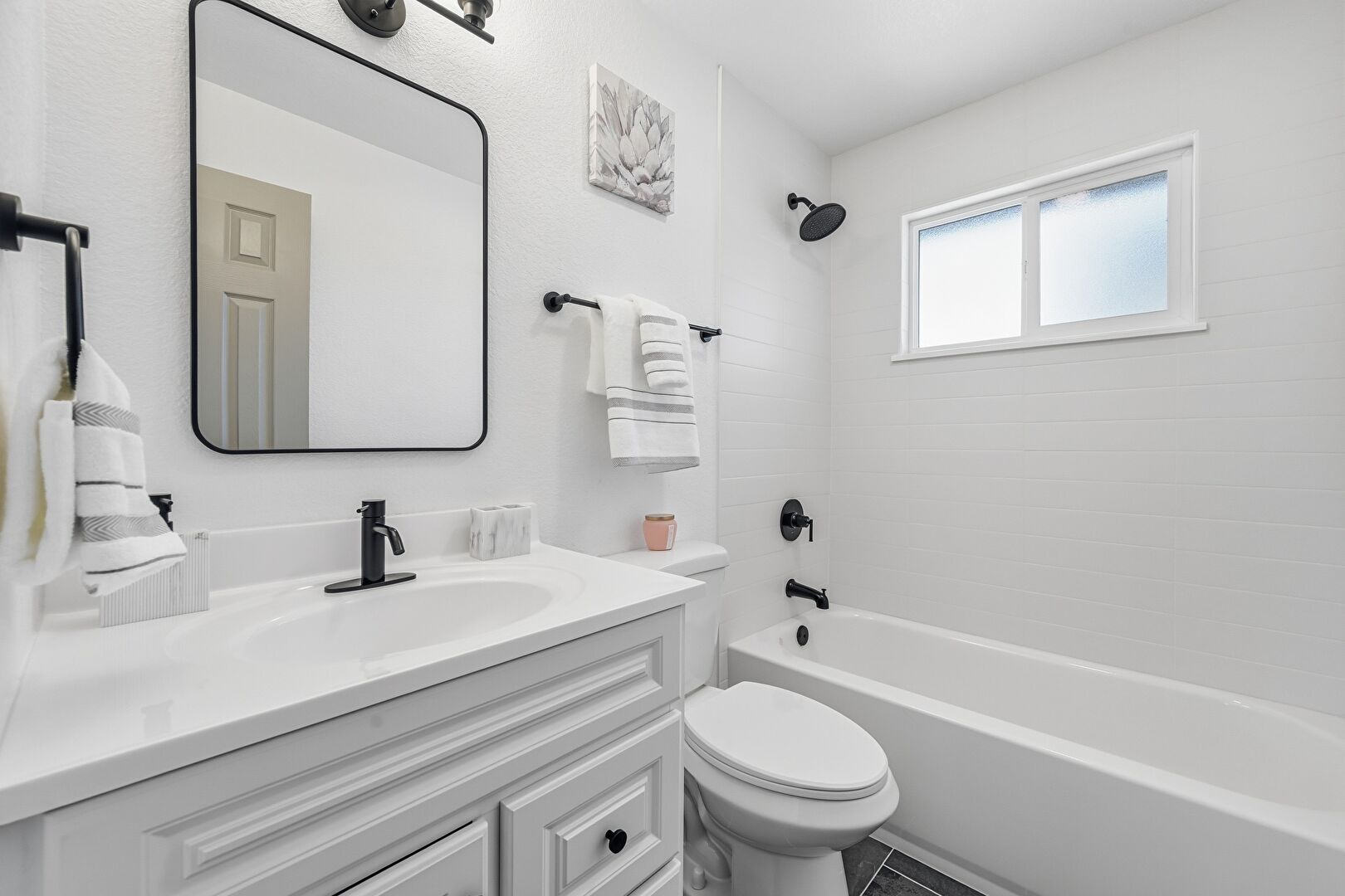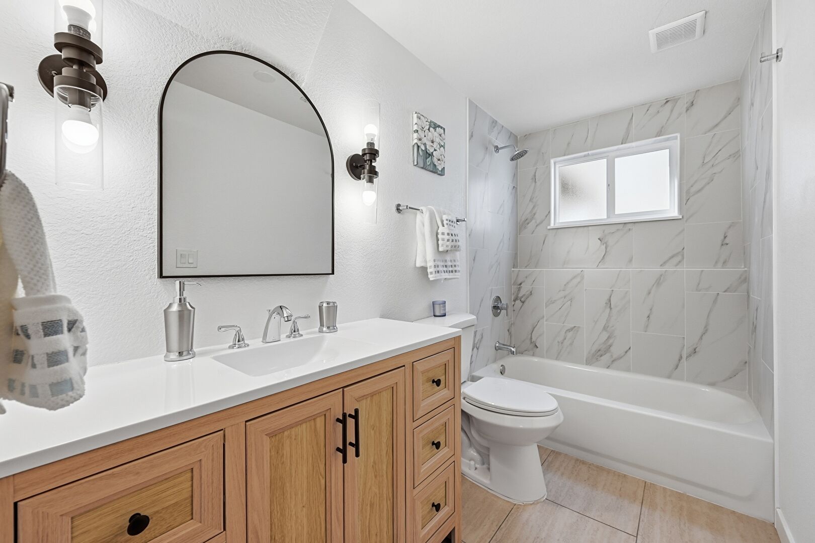 Combined Bath Shower, Full Bathroom, Natural Light, Textured Wall, Vanity, Vent