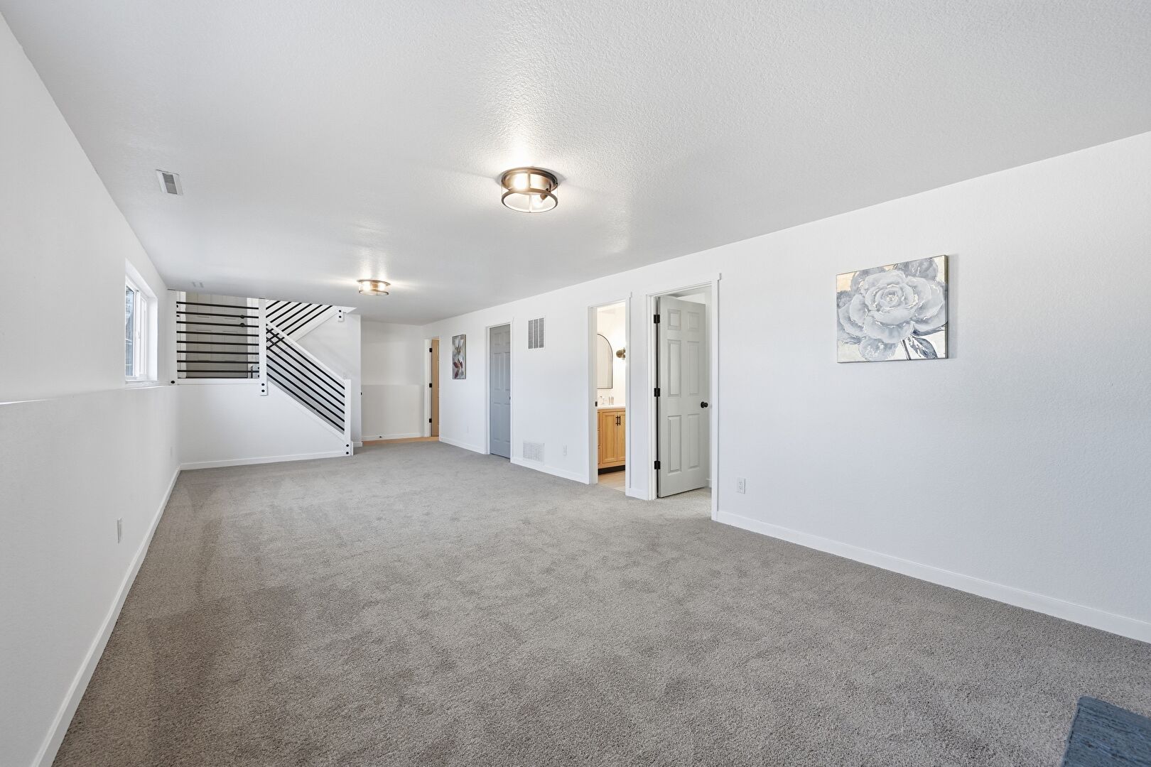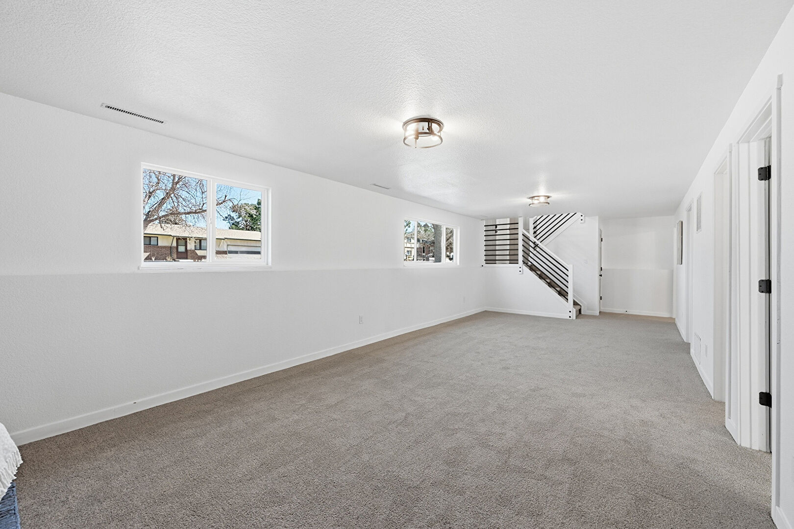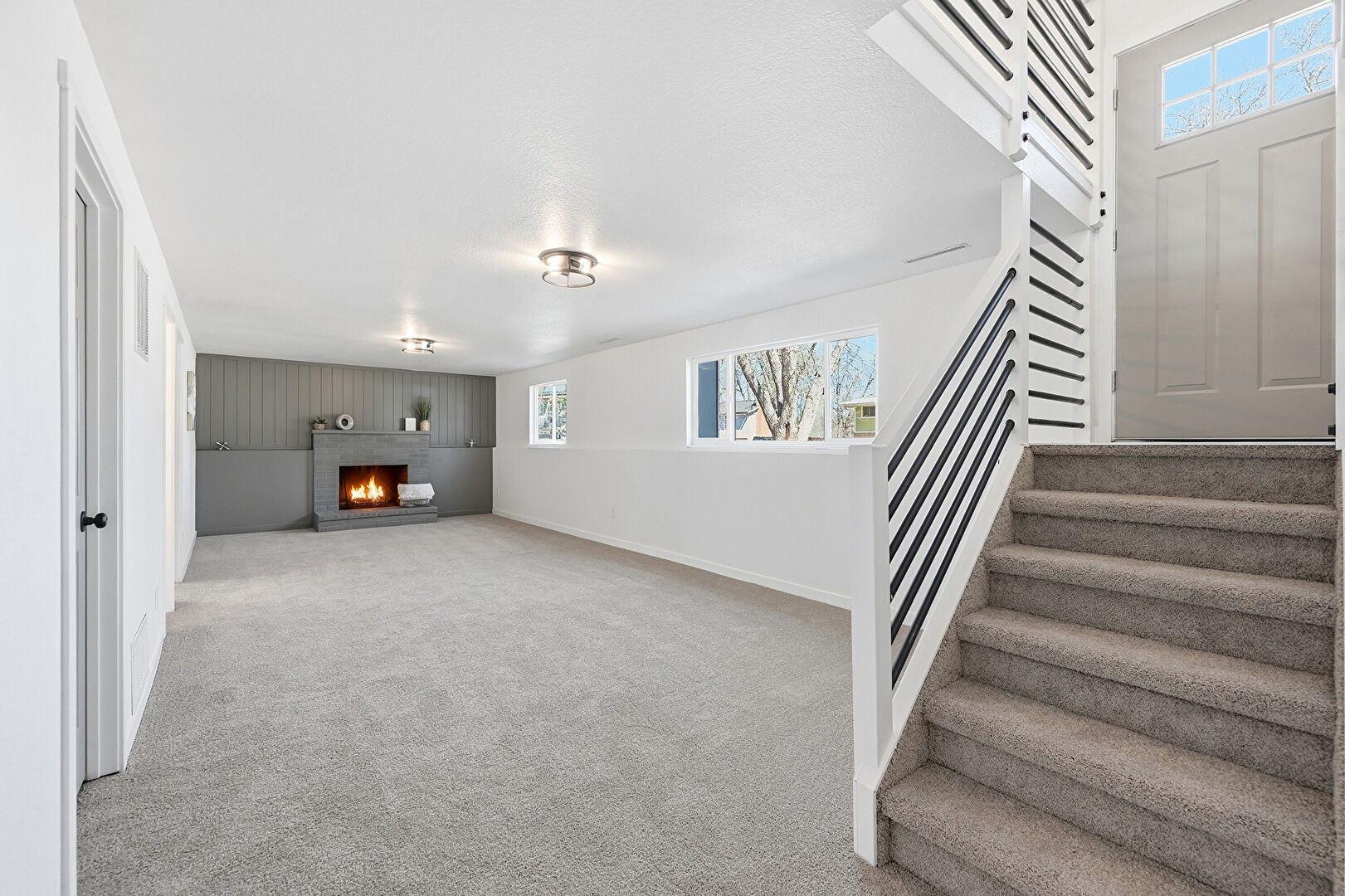 Baseboards Wall, Carpet, Drywall, Fireplace, Natural Light, Stairs, Textured Ceiling, Vent, Basement, Carpet