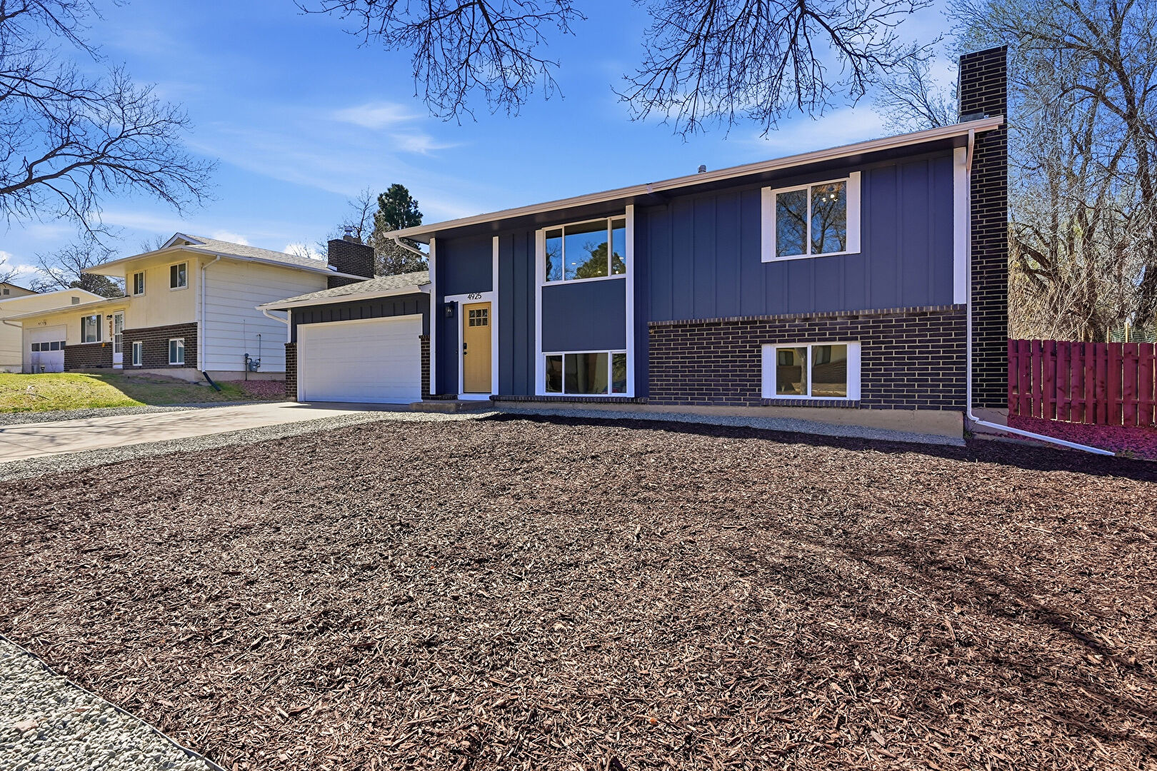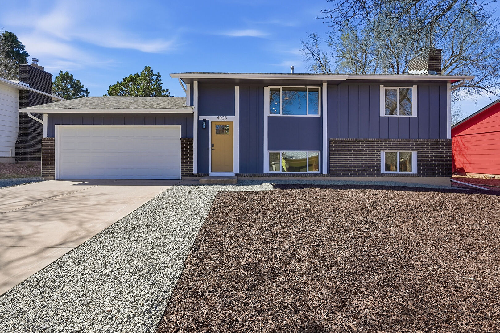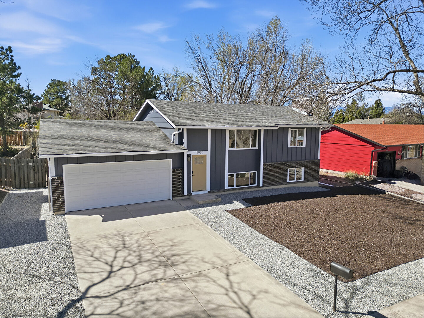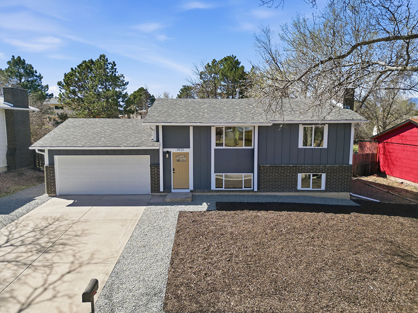 Board Batten Siding, Brick Siding, Chimney, Concrete Foundation, Downspout, Driveway, Fence, Gutters, Shingle Roof, Vertical Siding, Downspout, Fence, Gutters, Shingle Roof