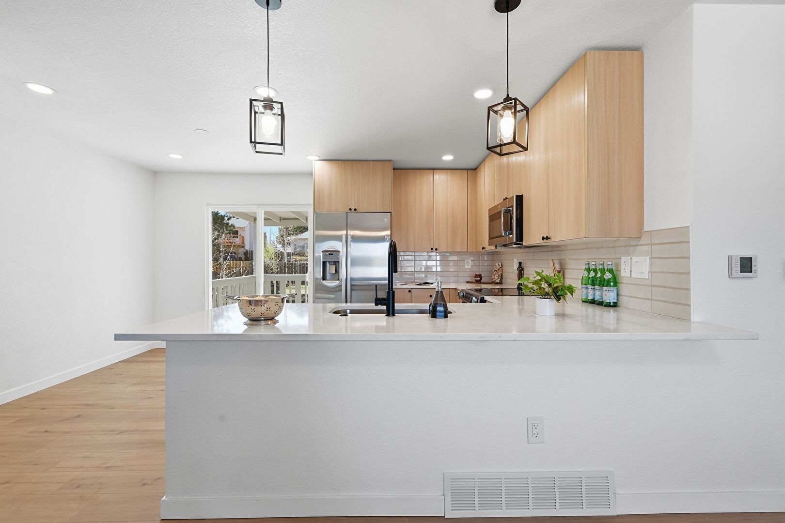Baseboards Wall, Drywall, Flat Panel Cabinets, Kitchen Bar, Kitchen Peninsula, Natural Light, Opens To Living Area, Pendant Lighting, Recessed Lighting, Stone Countertops, U Shaped Kitchen, Vent, Wood Finish Floor, Ceiling Fan, Flat Panel Cabinets, Stone Countertops