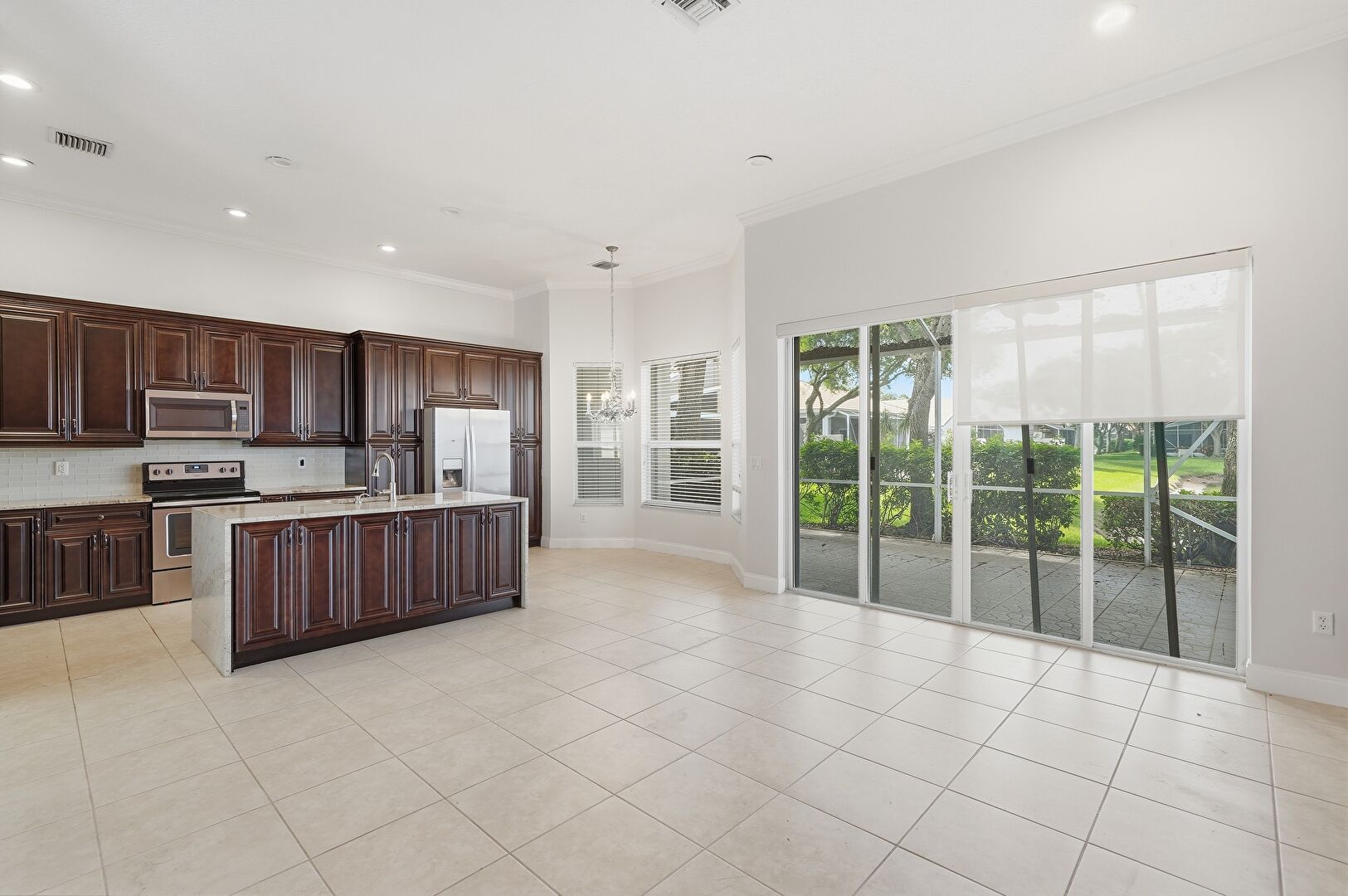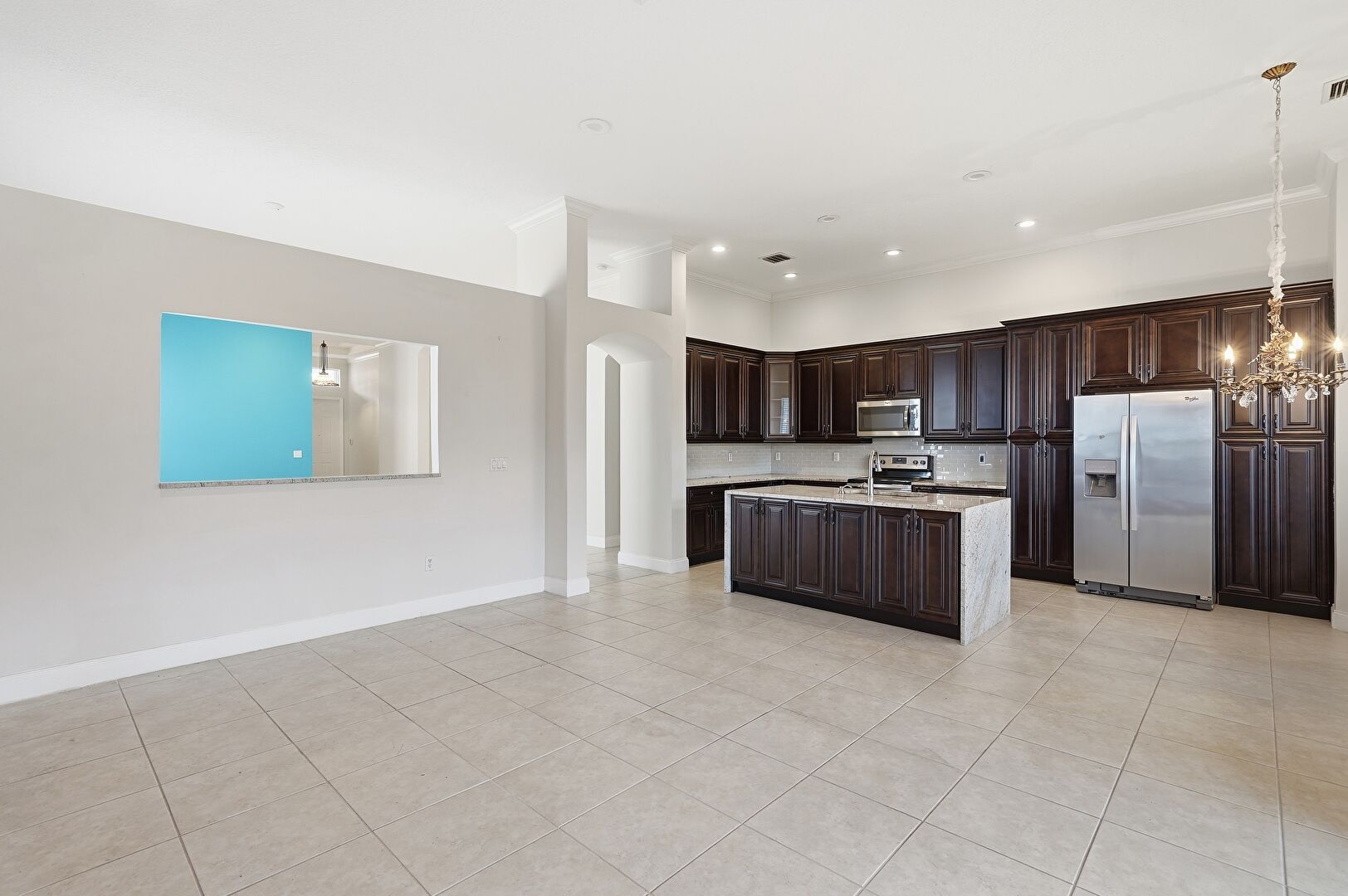 Accent Wall, Arched Walkways, Baseboards Wall, Crown Molding, Crown Molding Cabinets, Dark Brown Cabinets, Drywall, Kitchen Island, L Shaped Kitchen, Natural Light, Notable Chandelier, Opens To Living Area, Pendant Lighting, Raised Cabinets, Recessed Lighting, Stone Countertops, Sunroom, Tile Floor, Vent, Kitchen Island, Notable Chandelier, Recessed Lighting
