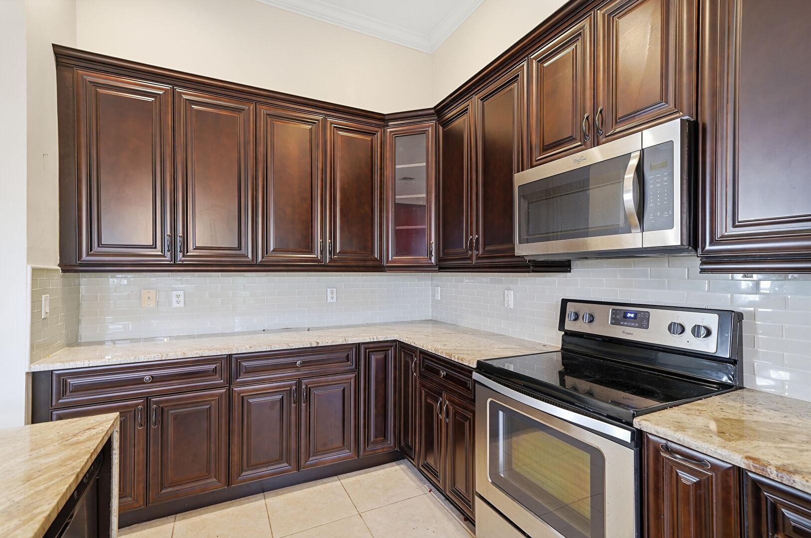 Arched Walkways, Baseboards Wall, Crown Molding, Crown Molding Cabinets, Dark Brown Cabinets, Drywall, Glass Insert Cabinets, Kitchen Island, L Shaped Kitchen, Natural Light, Notable Chandelier, Pendant Lighting, Raised Cabinets, Recessed Lighting, Stone Countertops, Tile Floor, Vent, Crown Molding Cabinets, Raised Cabinets, Tile Floor