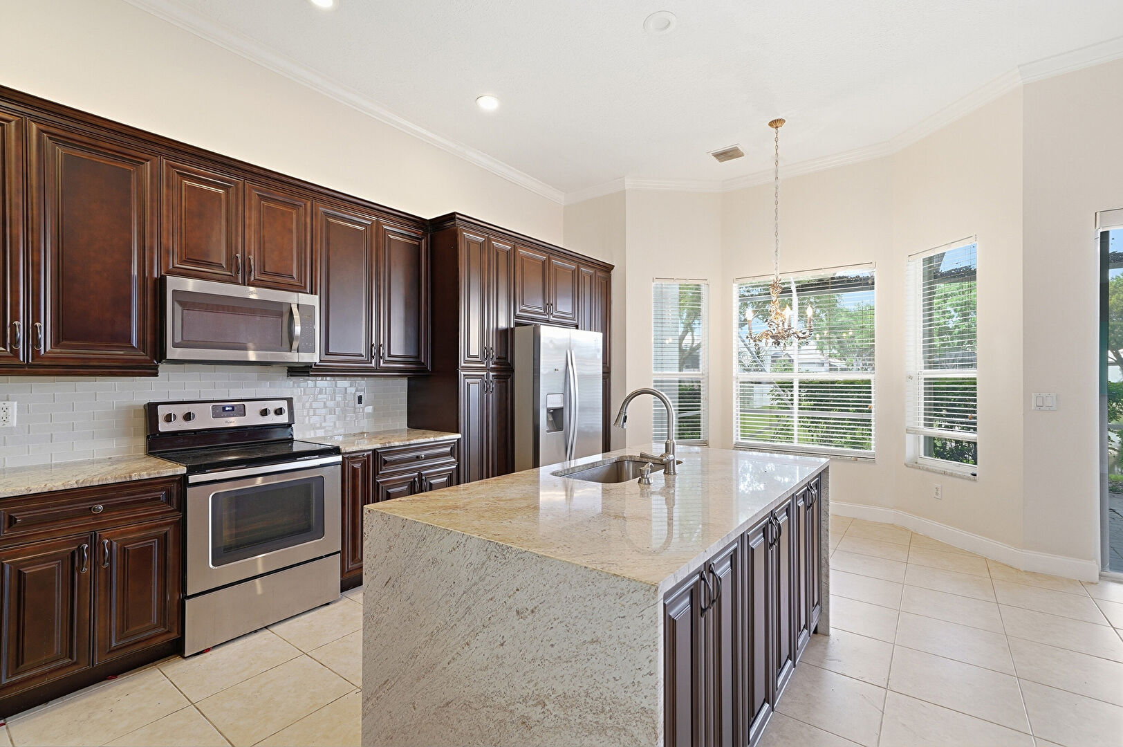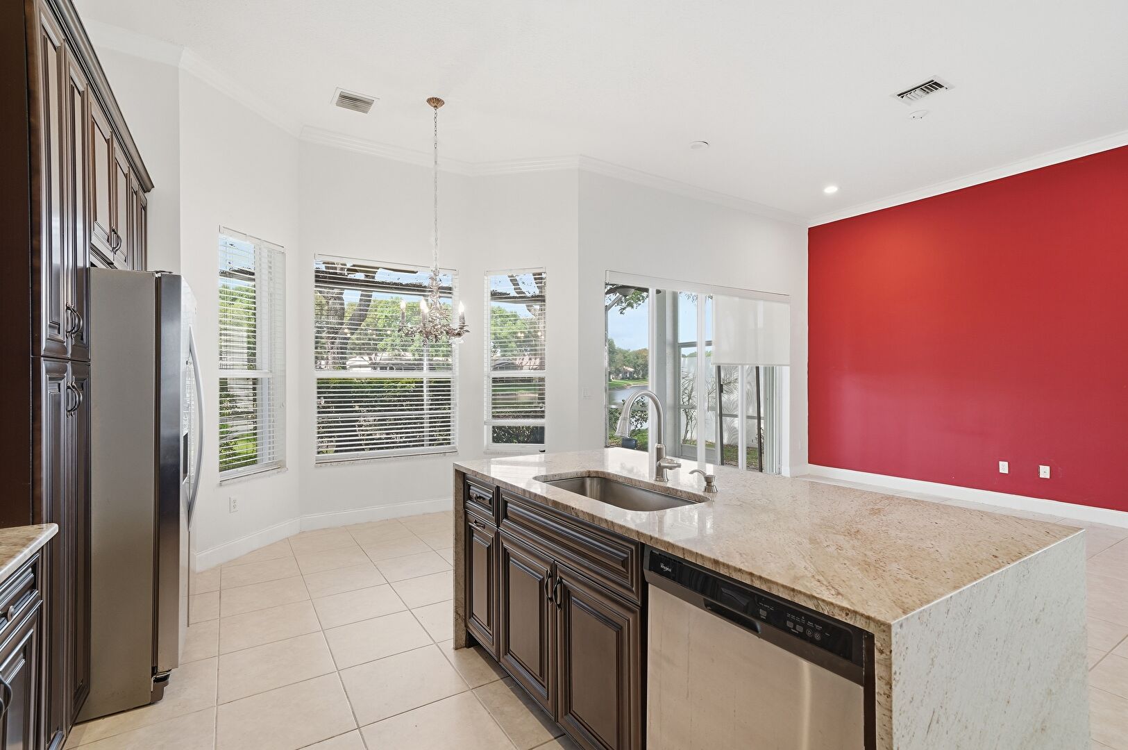 Baseboards Wall, Crown Molding, Crown Molding Cabinets, Dark Brown Cabinets, Drywall, Natural Light, Notable Chandelier, Pendant Lighting, Raised Cabinets, Recessed Lighting, Stone Countertops, Tile Floor, Natural Light, Vent