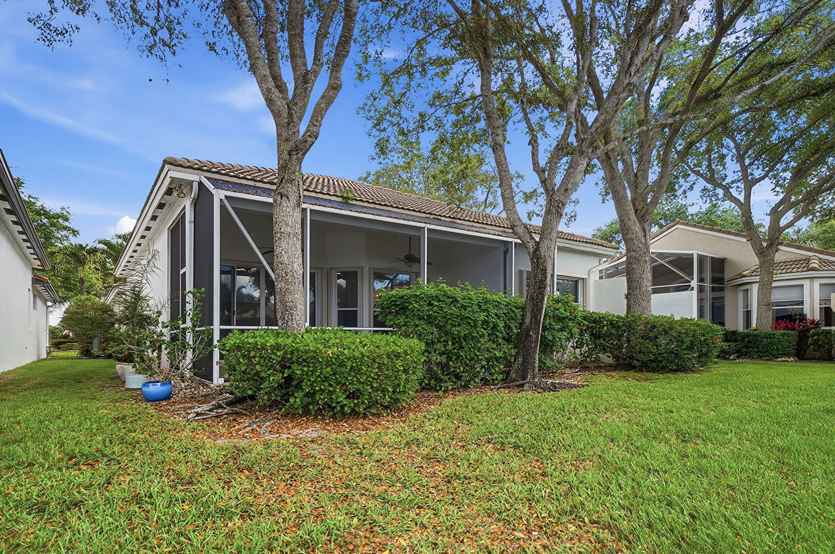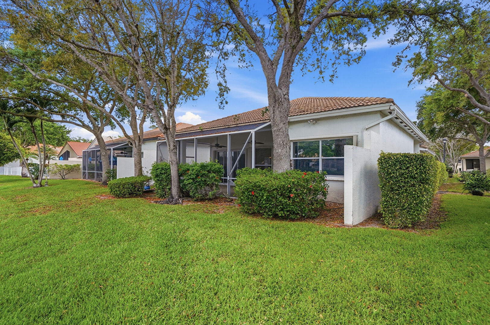 Gutters, Lanai, Lawn, Stucco Siding, Sunroom, Tile Roof, Ceiling Fan, Downspout, Sunroom