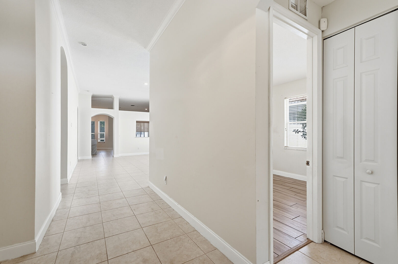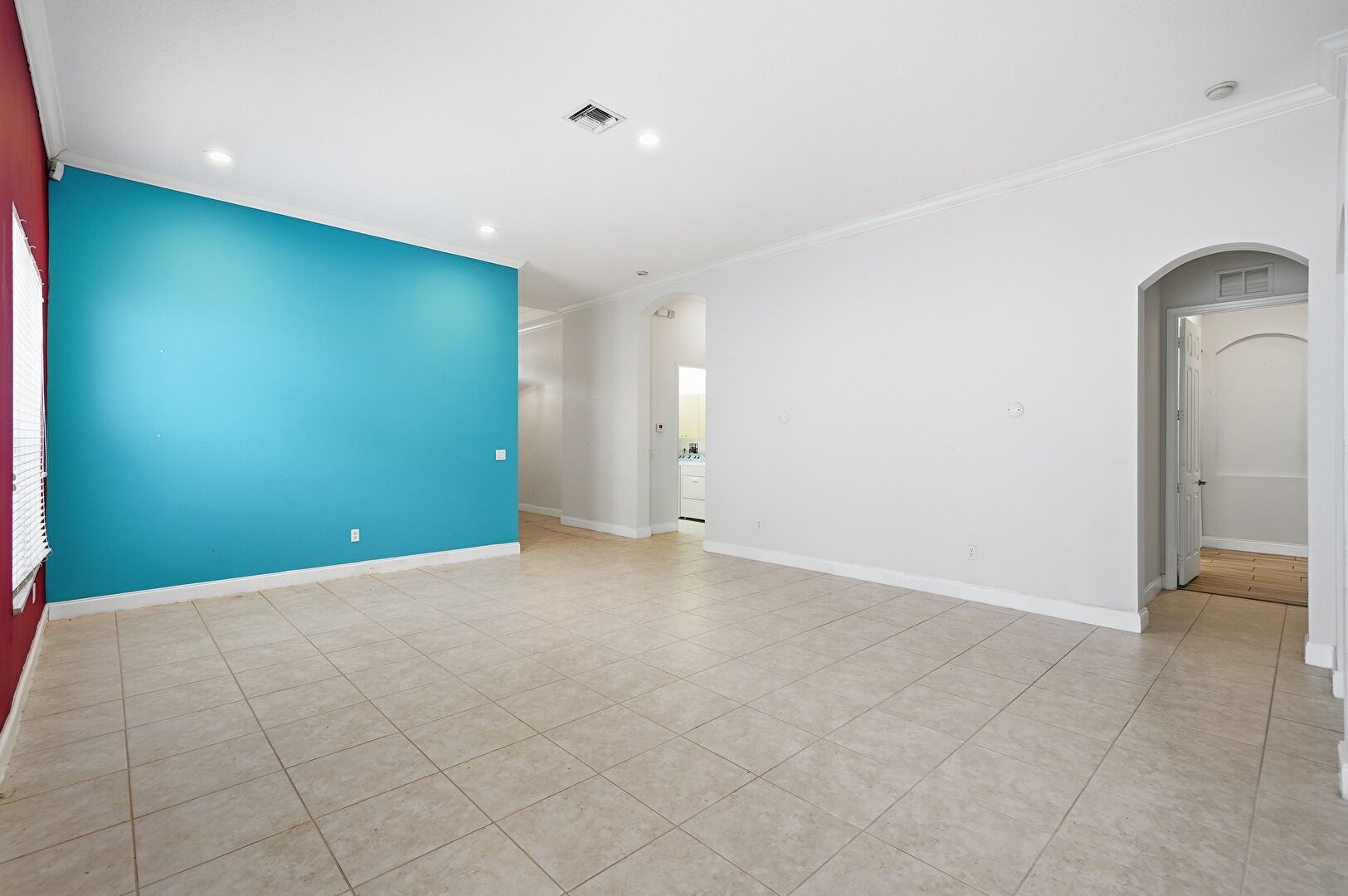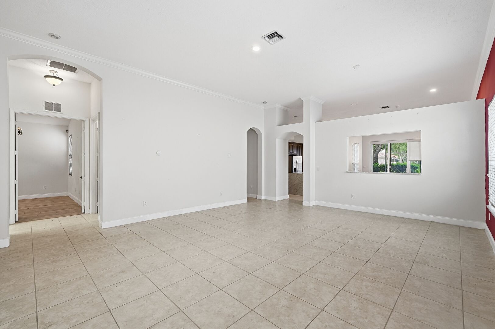 Arched Walkways, Baseboards Wall, Crown Molding, Drywall, Natural Light, Recessed Lighting, Tile Floor, Vent, Arched Walkways, Baseboards Wall, Tile Floor, Vent