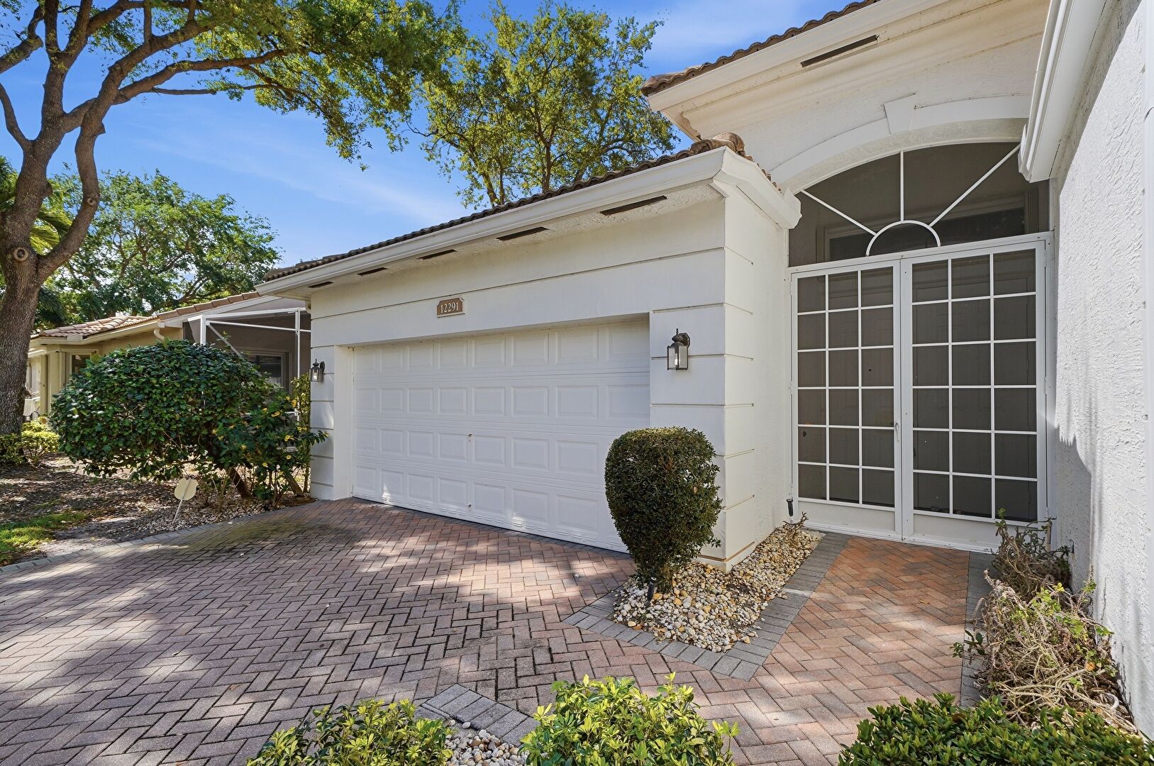Downspout, Driveway, Gutters, Lawn, Stucco Siding, Tile Roof, Sunroom, Tile Roof