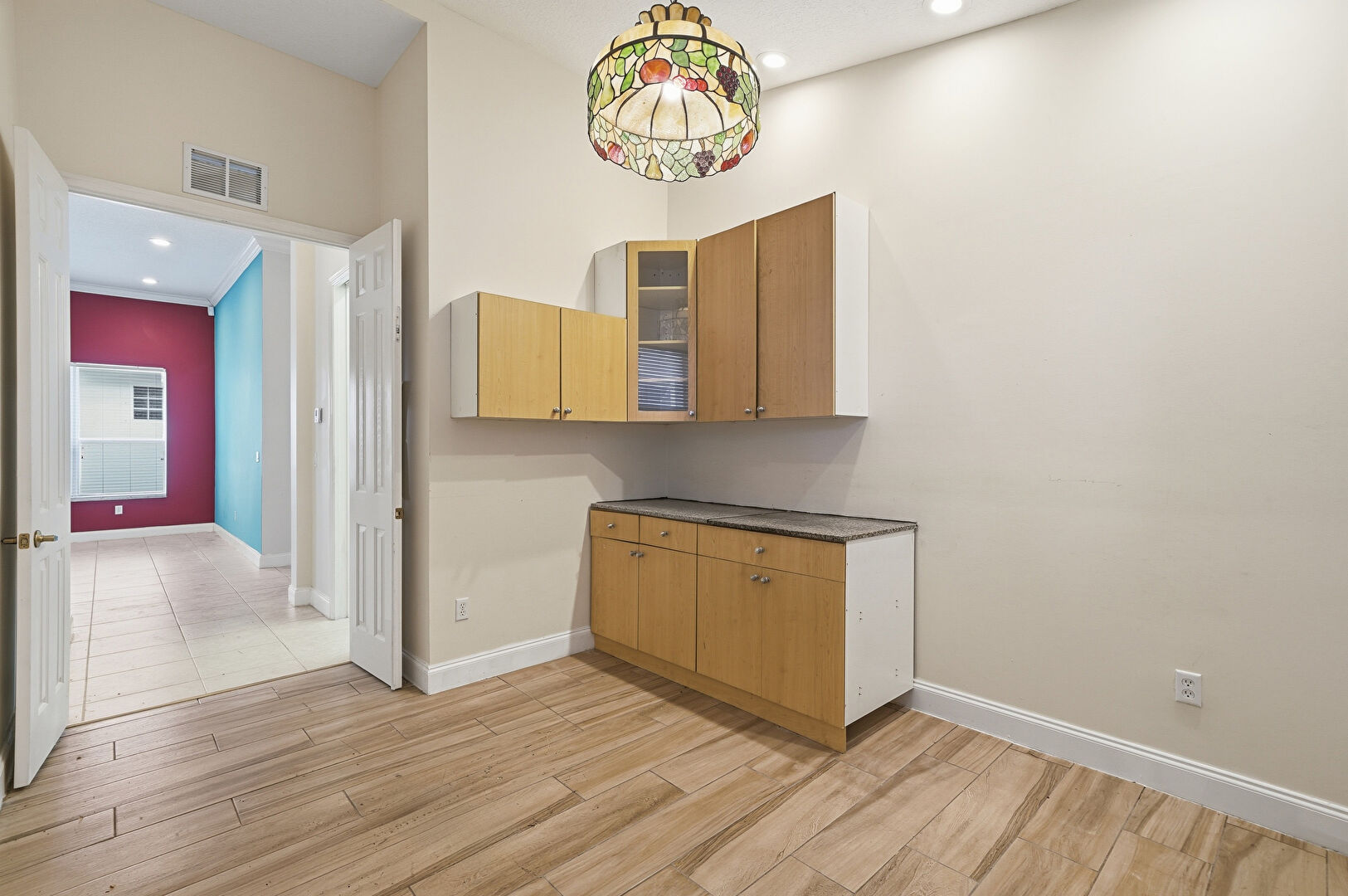 Baseboards Wall, Drywall, Glass Insert Cabinets, Medium Brown Cabinets, Natural Light, Pendant Lighting, Recessed Lighting, Vent, Wood Finish Floor, Drywall, Wood Finish Floor
