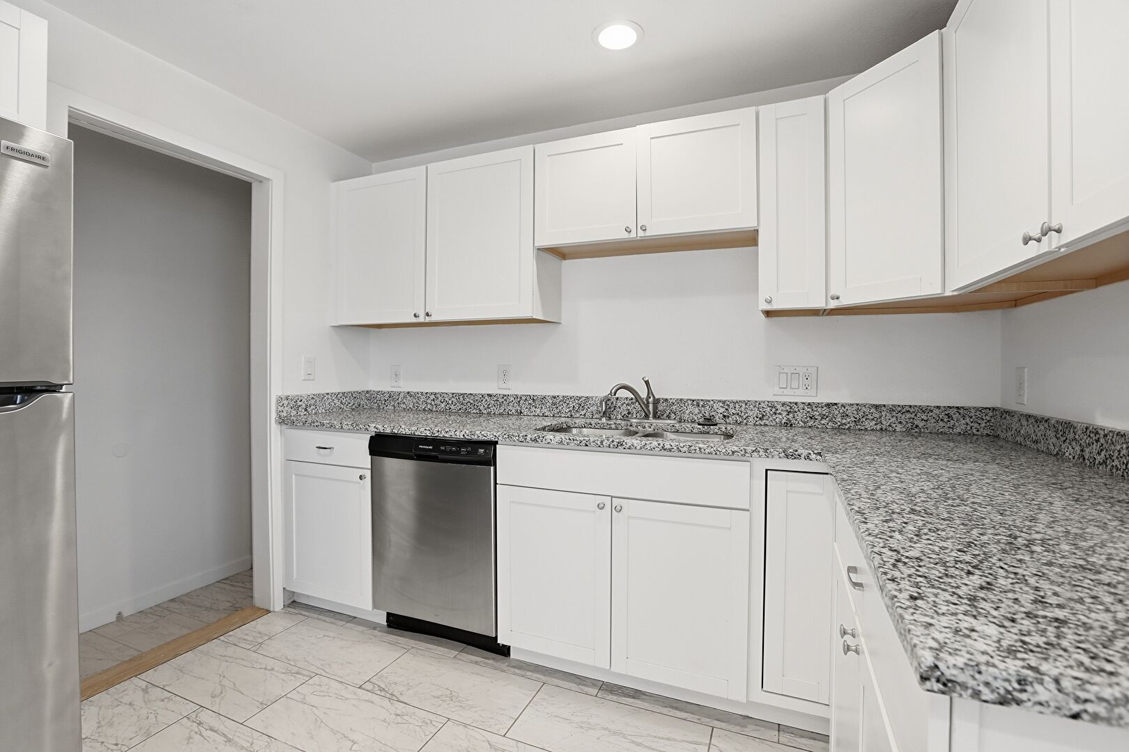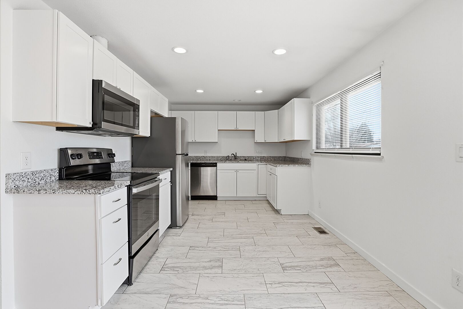 Baseboards Wall, Drywall, Marble Finish Floor, Natural Light, Opens To Living Area, Recessed Lighting, Shaker Cabinets, Stone Countertops, U Shaped Kitchen, Vent, Wood Finish Floor, Baseboards Wall, Natural Light, Stone Countertops, Wood Finish Floor