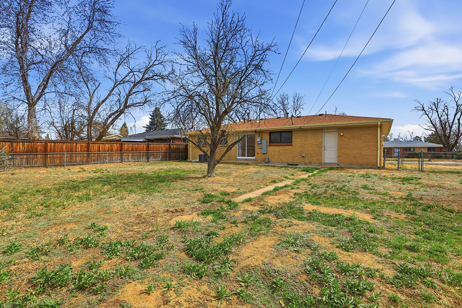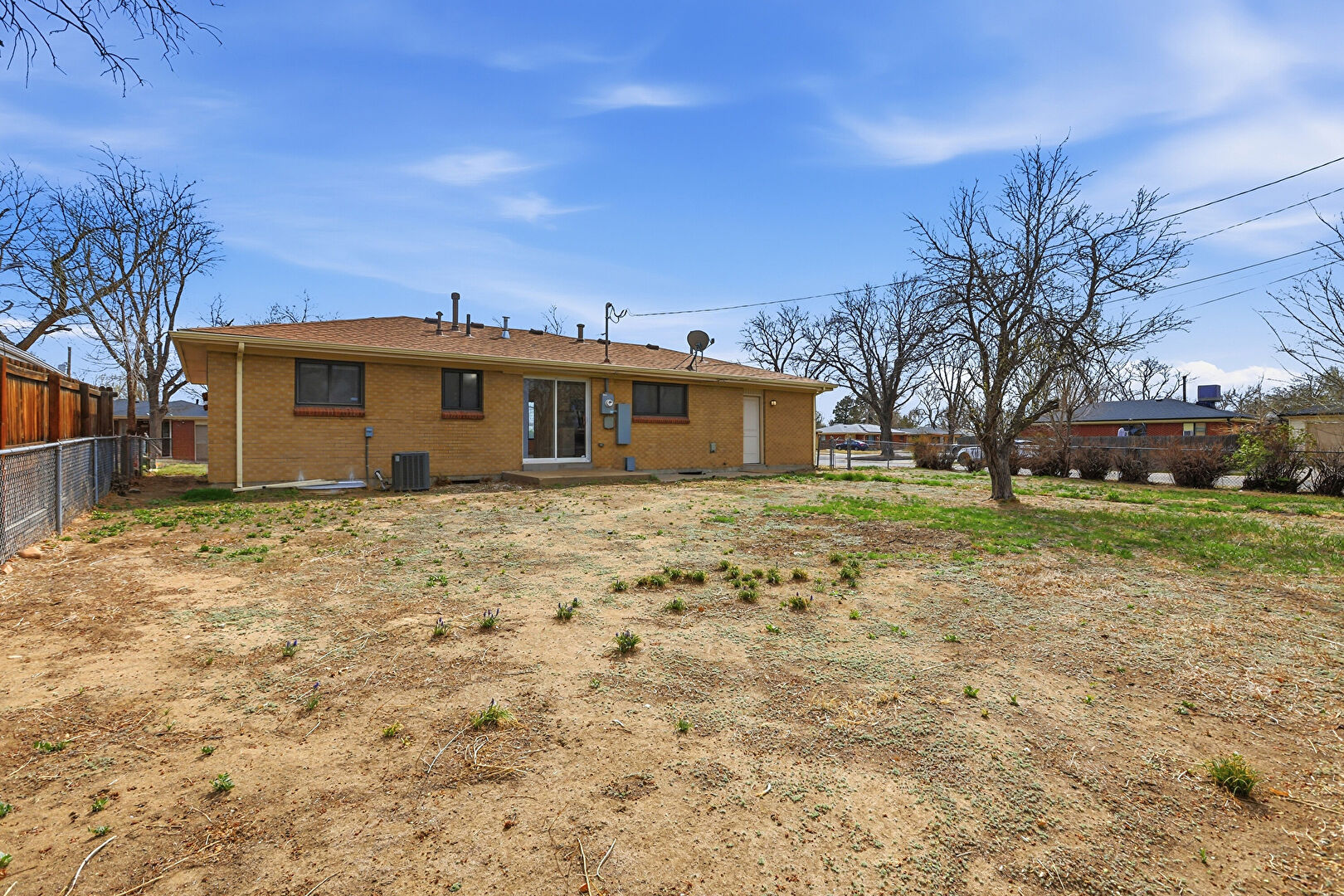Brick Siding, Central Ac, Downspout, Fence, Lawn, Patio, Satellite Dish, Concrete Foundation