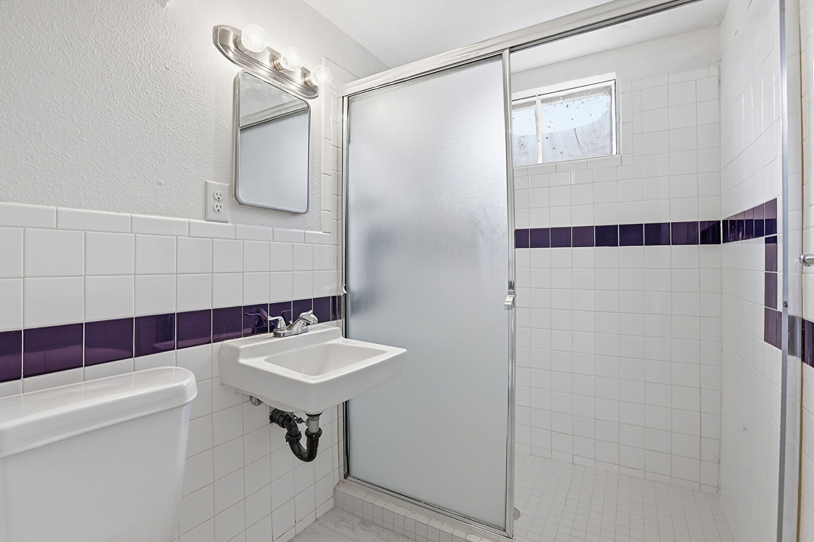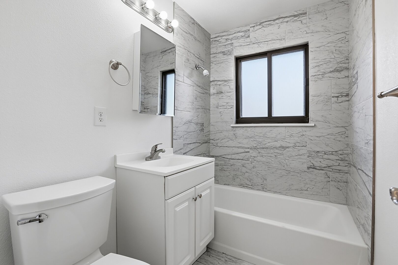 Combined Bath Shower, Full Bathroom, Natural Light, Tile Wall, Vanity, Wainscot Wall, Drywall, Textured Wall