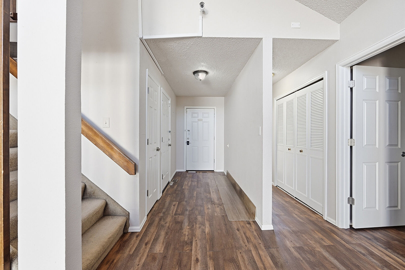 Baseboards Wall, Drywall, Natural Light, Stairs, Textured Ceiling, Textured Wall, Vaulted Ceiling, Wood Finish Floor, Baseboards Wall, Textured Ceiling