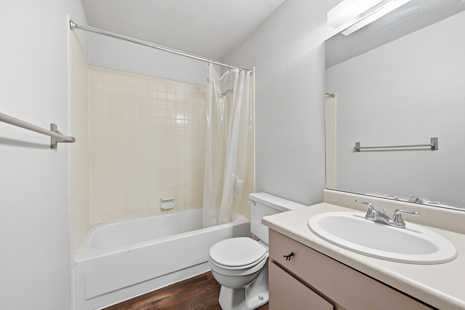 Drywall, Full Bathroom, Vanity, Wood Finish Floor, Combined Bath Shower