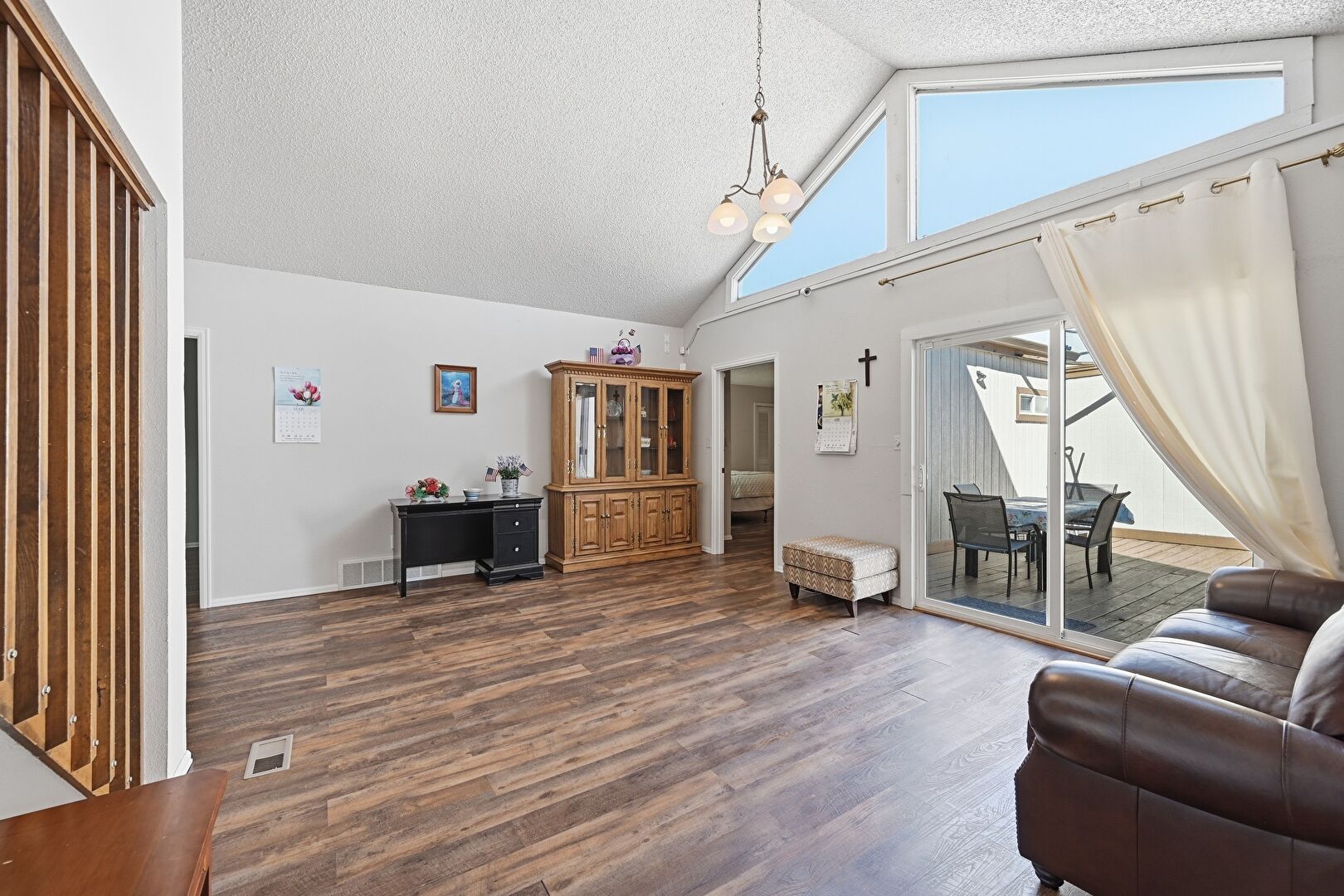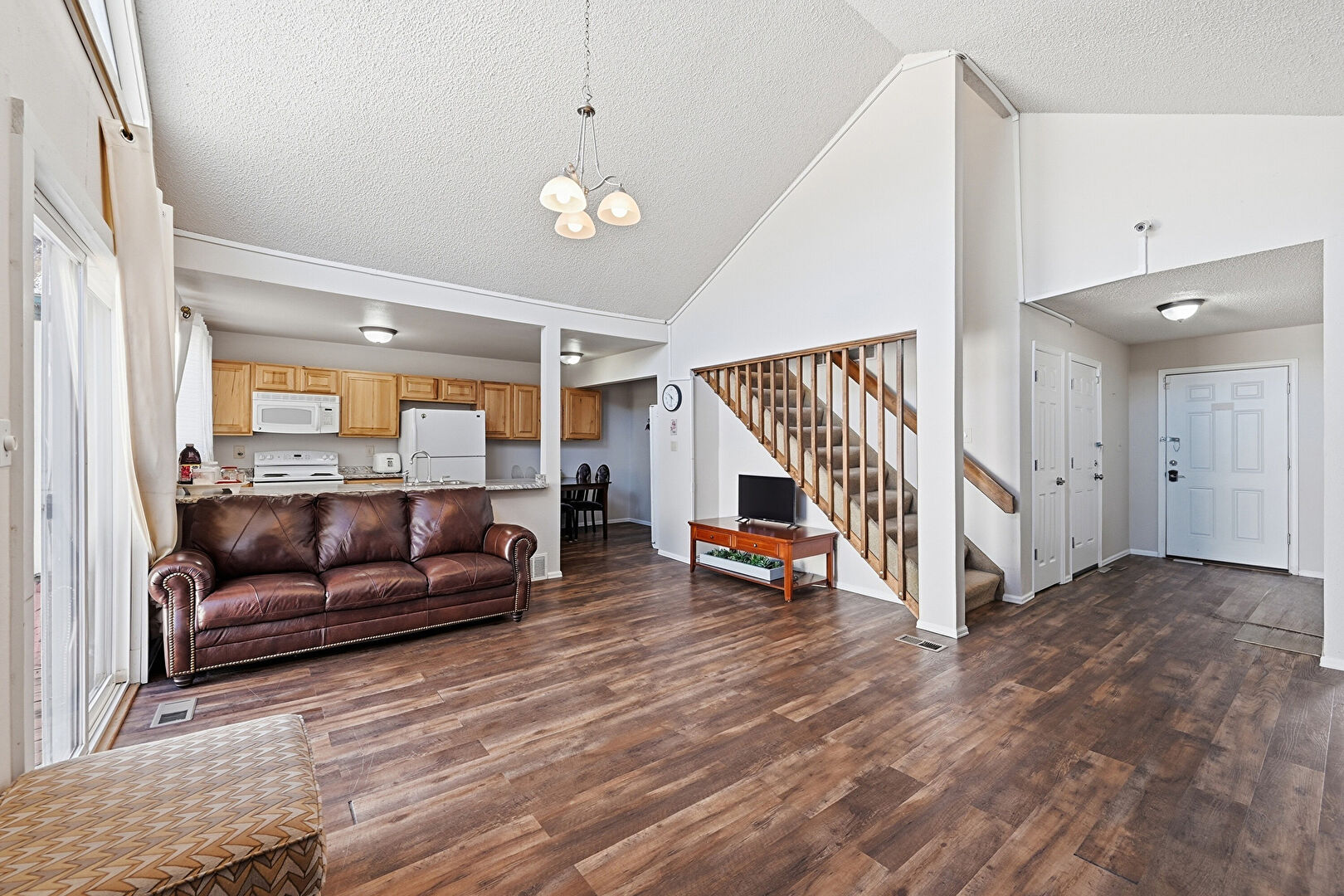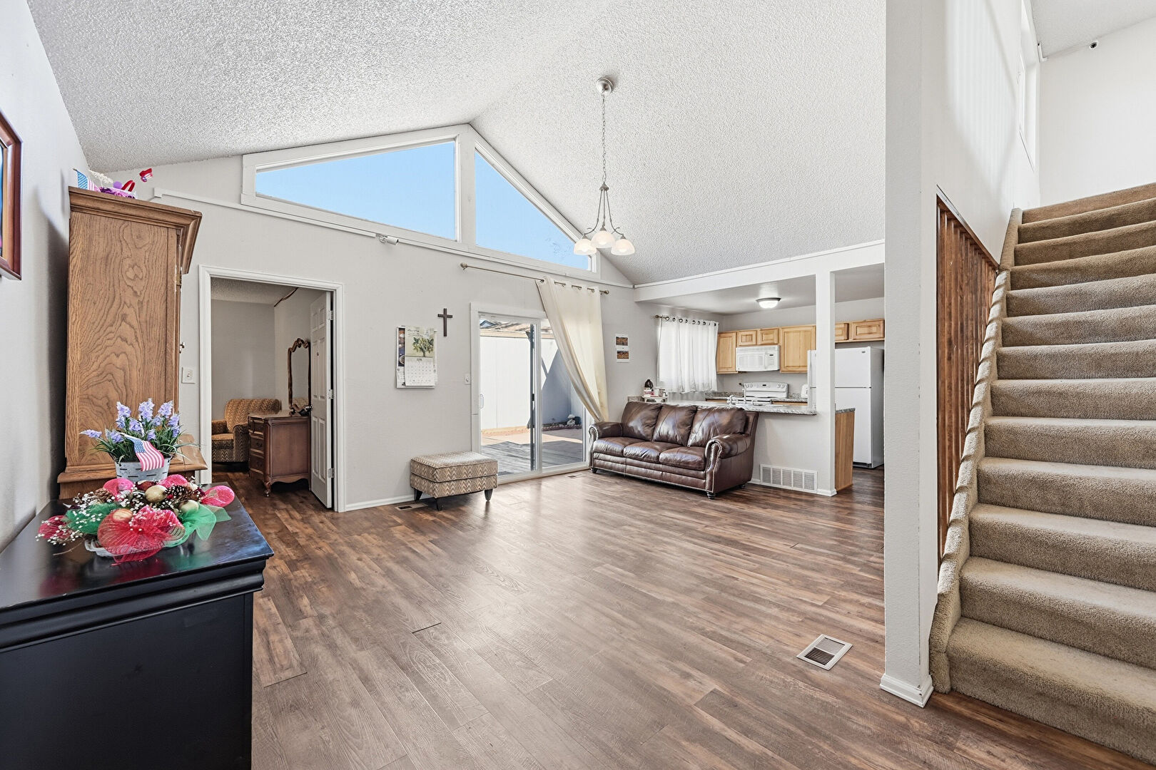 Baseboards Wall, Cathedral Ceiling, Drywall, High Ceiling, Natural Light, Notable Chandelier, Stairs, Textured Ceiling, Vaulted Ceiling, Vent, Wood Finish Floor, Cathedral Ceiling, Drywall, Natural Light