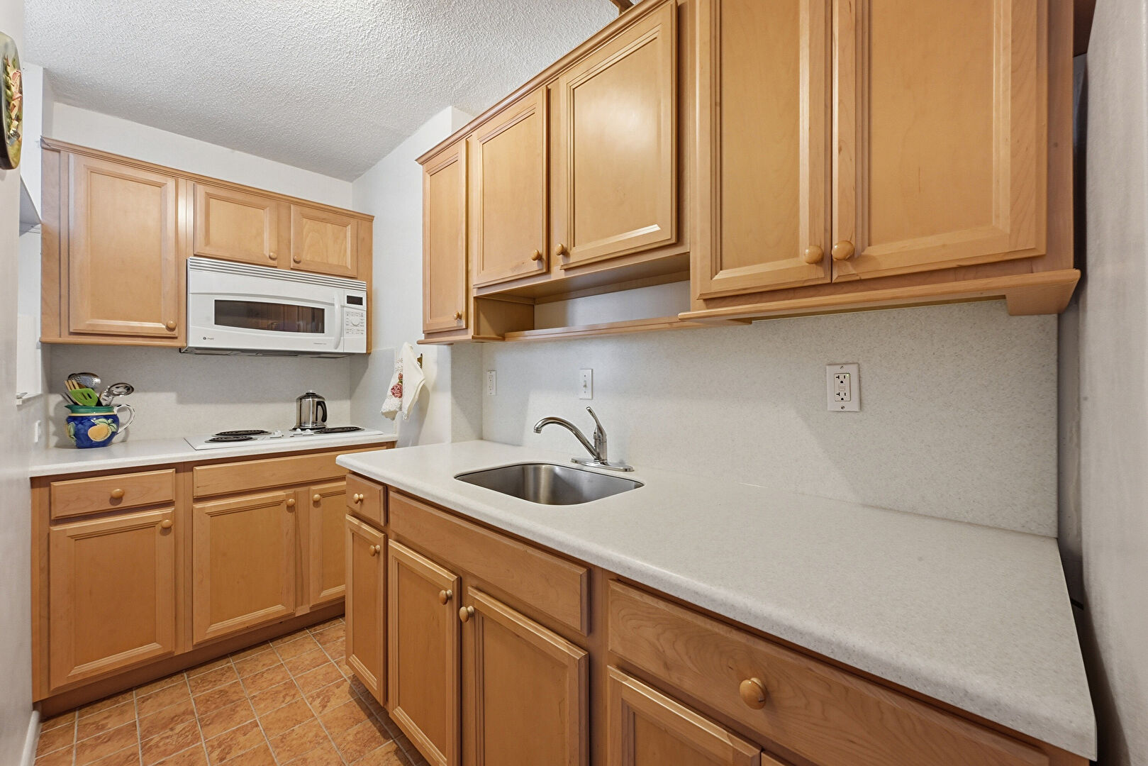 Baseboards Wall, Crown Molding Cabinets, Drywall, Open Shelves, Shaker Cabinets, Textured Ceiling, Tile Floor, Natural Light, Open Shelves, Textured Ceiling
