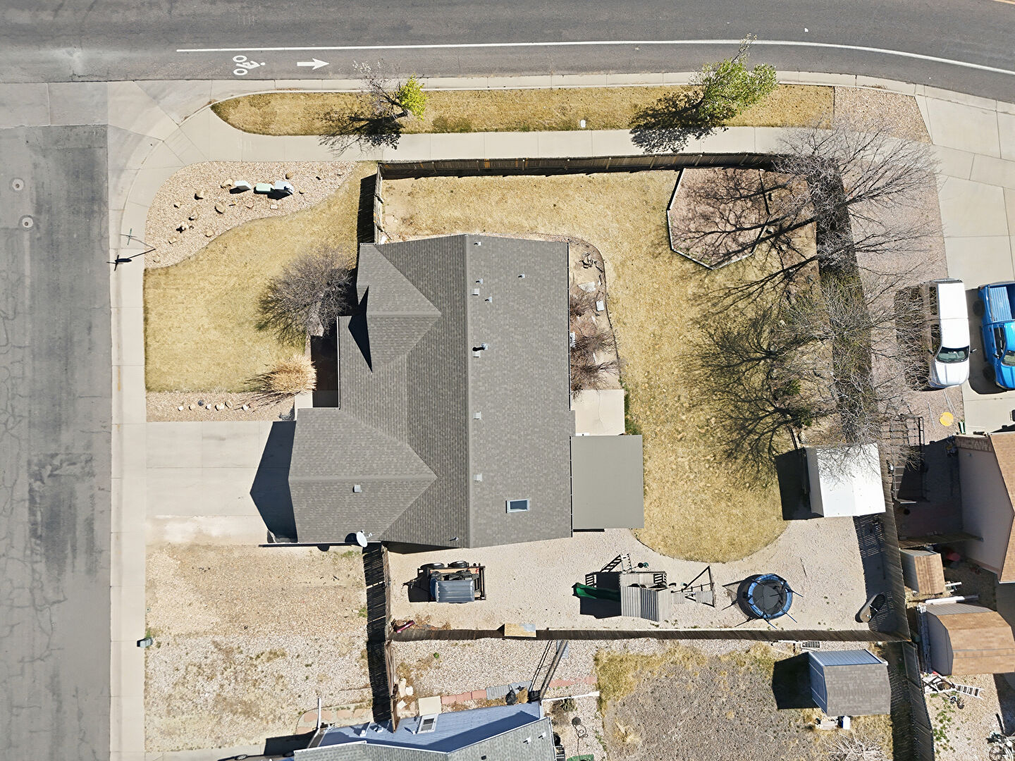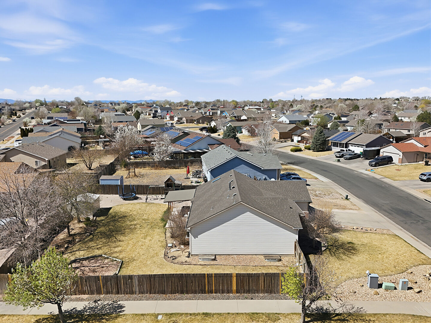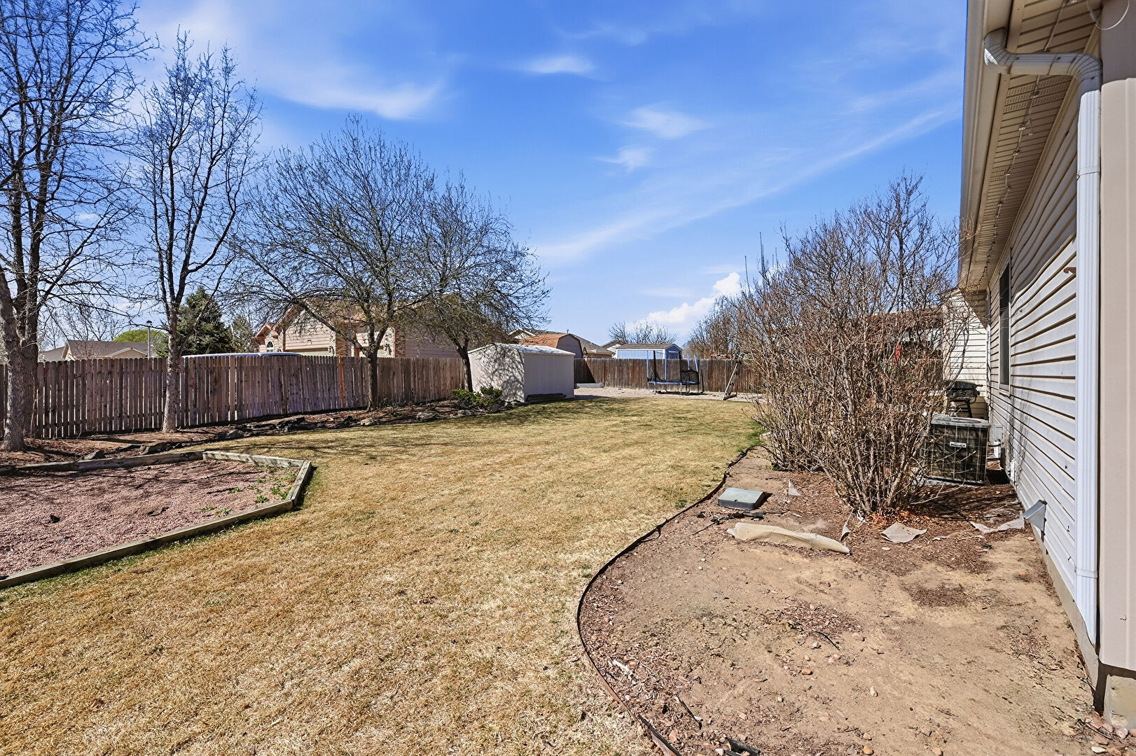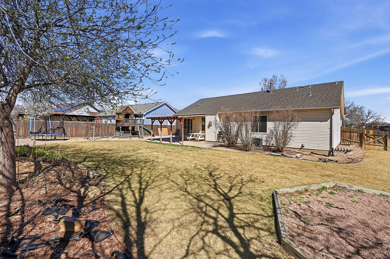 Concrete Foundation, Downspout, Fence, Garden, Gazebo, Horizontal Siding, Lawn, Patio, Playground, Shingle Roof, Trampoline, Fence, Lawn
