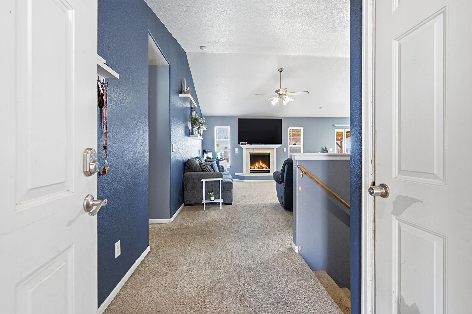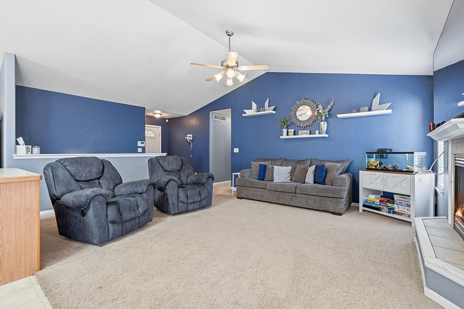 Baseboards Wall, Carpet, Ceiling Fan, Natural Light, Textured Ceiling, Textured Wall, Vaulted Ceiling, Fireplace