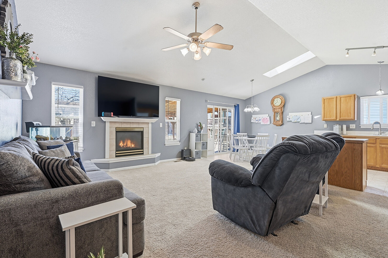 Baseboards Wall, Carpet, Cathedral Ceiling, Ceiling Fan, Drywall, Fireplace, Natural Light, Notable Chandelier, Skylight, Track Lighting, Vaulted Ceiling, Vent, Baseboards Wall, Carpet, Vaulted Ceiling