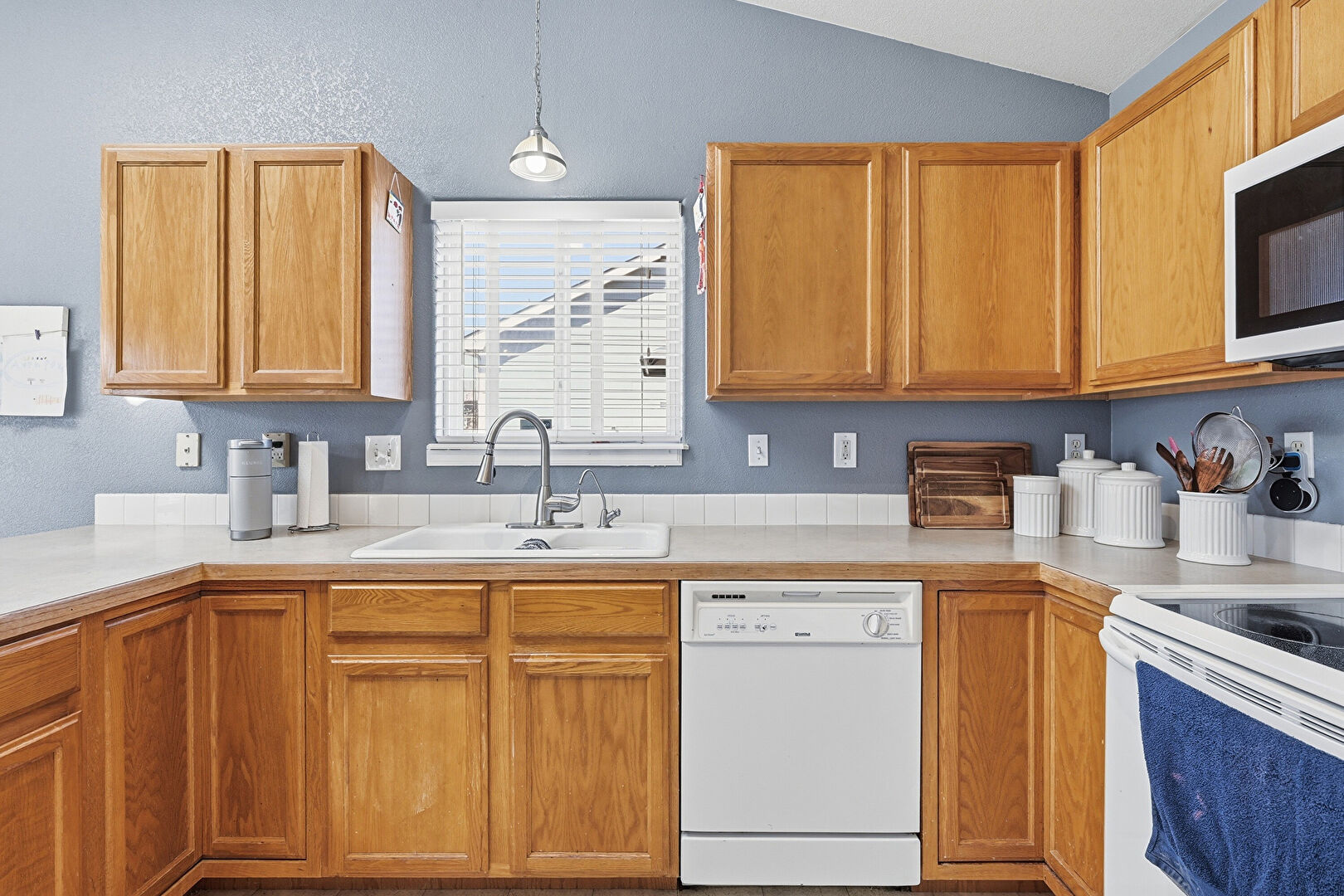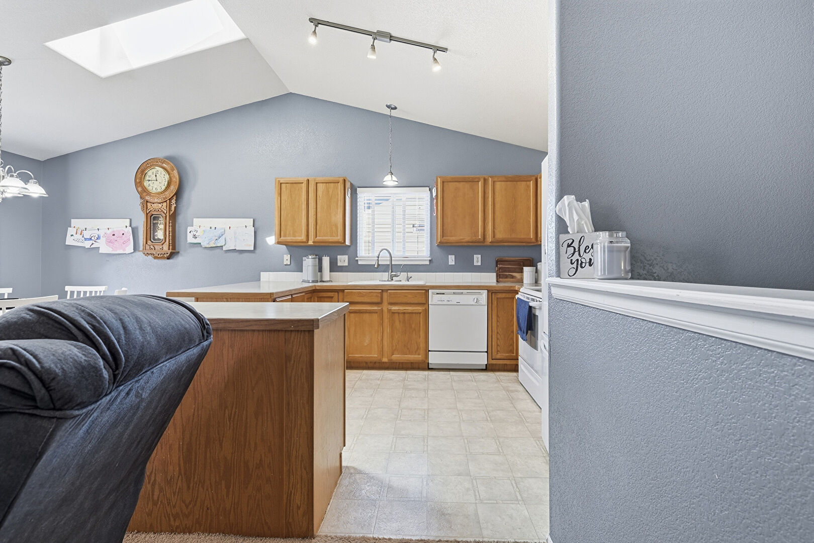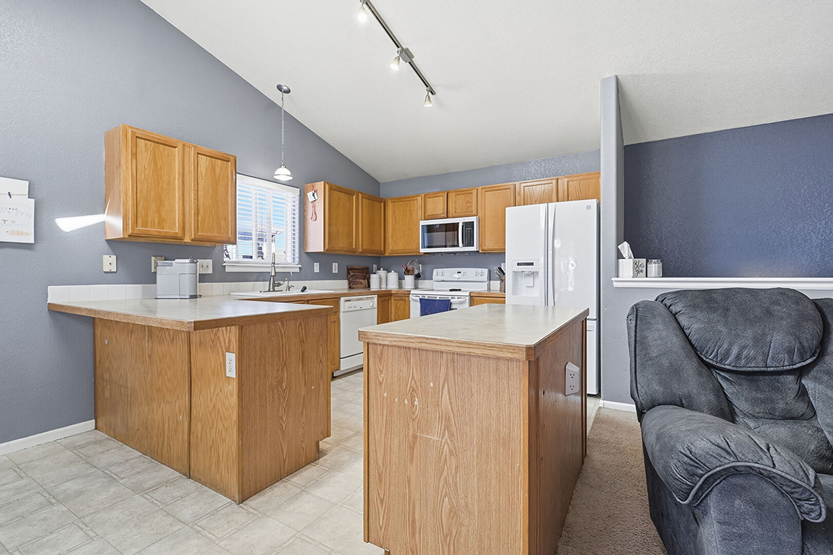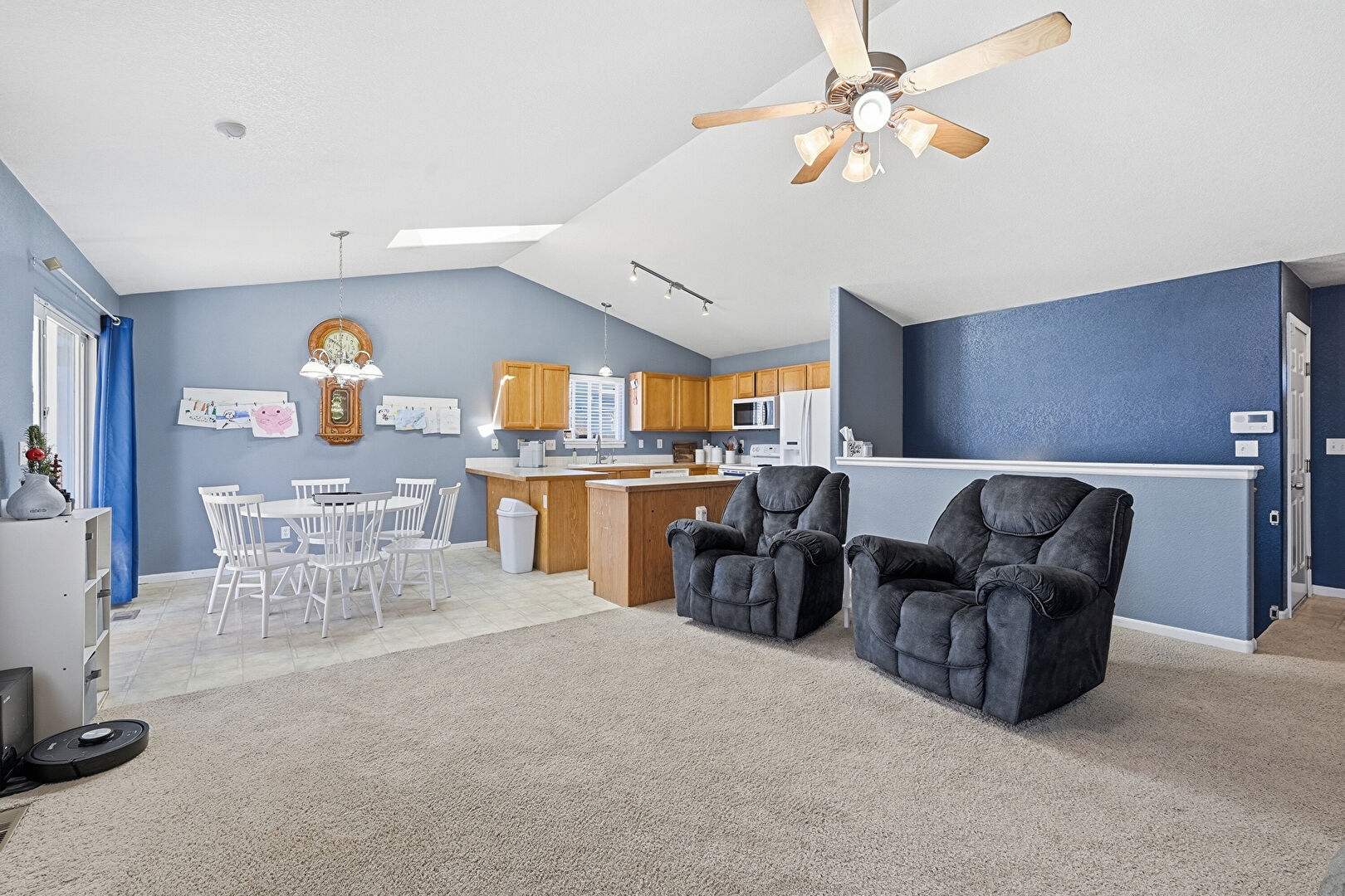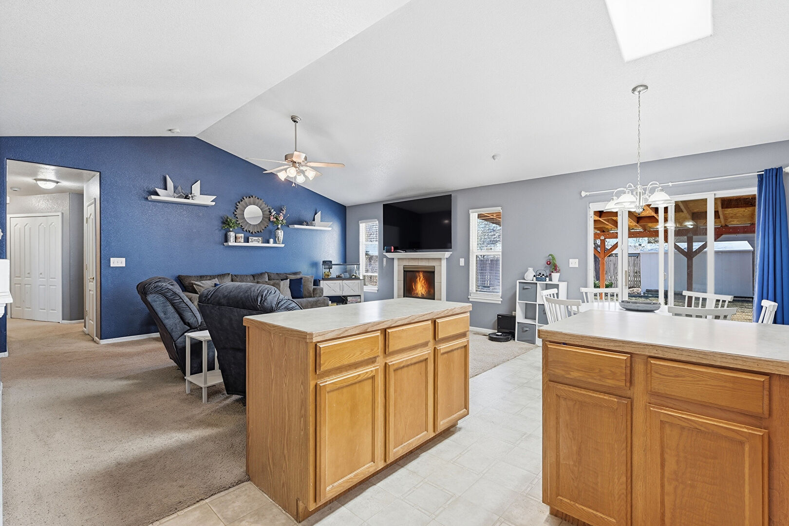 Carpet, Cathedral Ceiling, Ceiling Fan, Drywall, Fireplace, G Shaped Kitchen, Kitchen Bar, Kitchen Island, Kitchen Peninsula, Medium Brown Cabinets, Natural Light, Notable Chandelier, Opens To Living Area, Pendant Lighting, Shaker Cabinets, Skylight, Textured Wall, Track Lighting, Vaulted Ceiling, Vinyl Floor, Baseboards Wall, Kitchen Island, Natural Light, Vinyl Floor