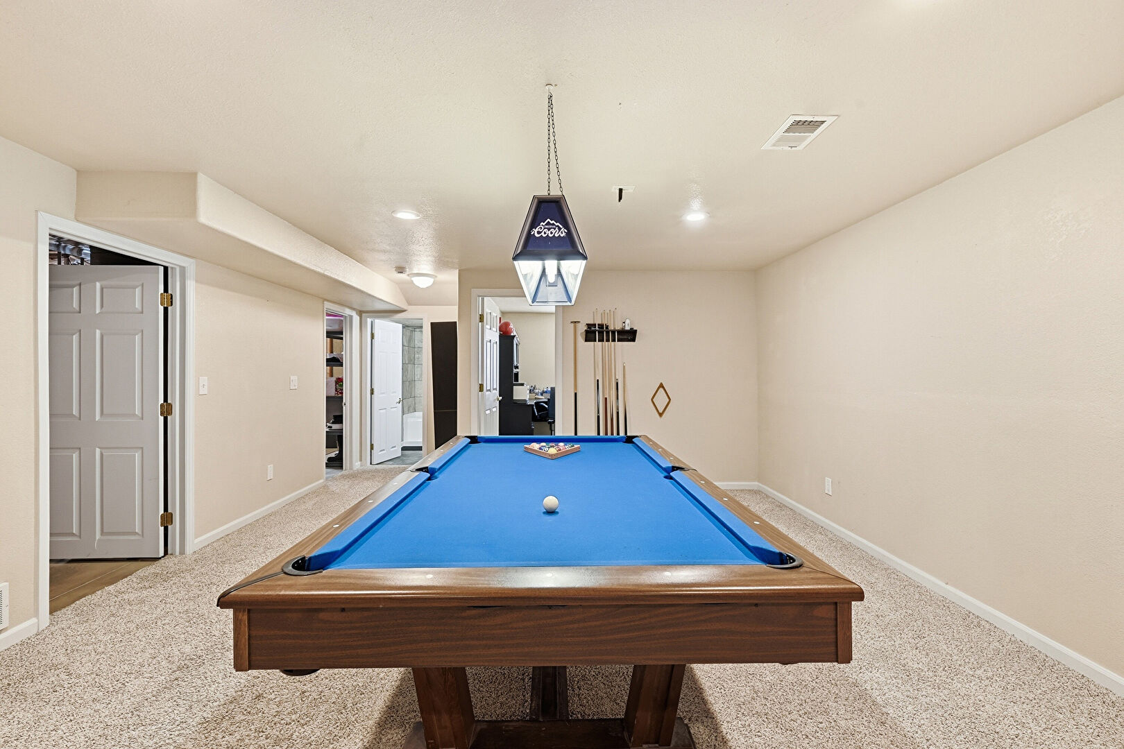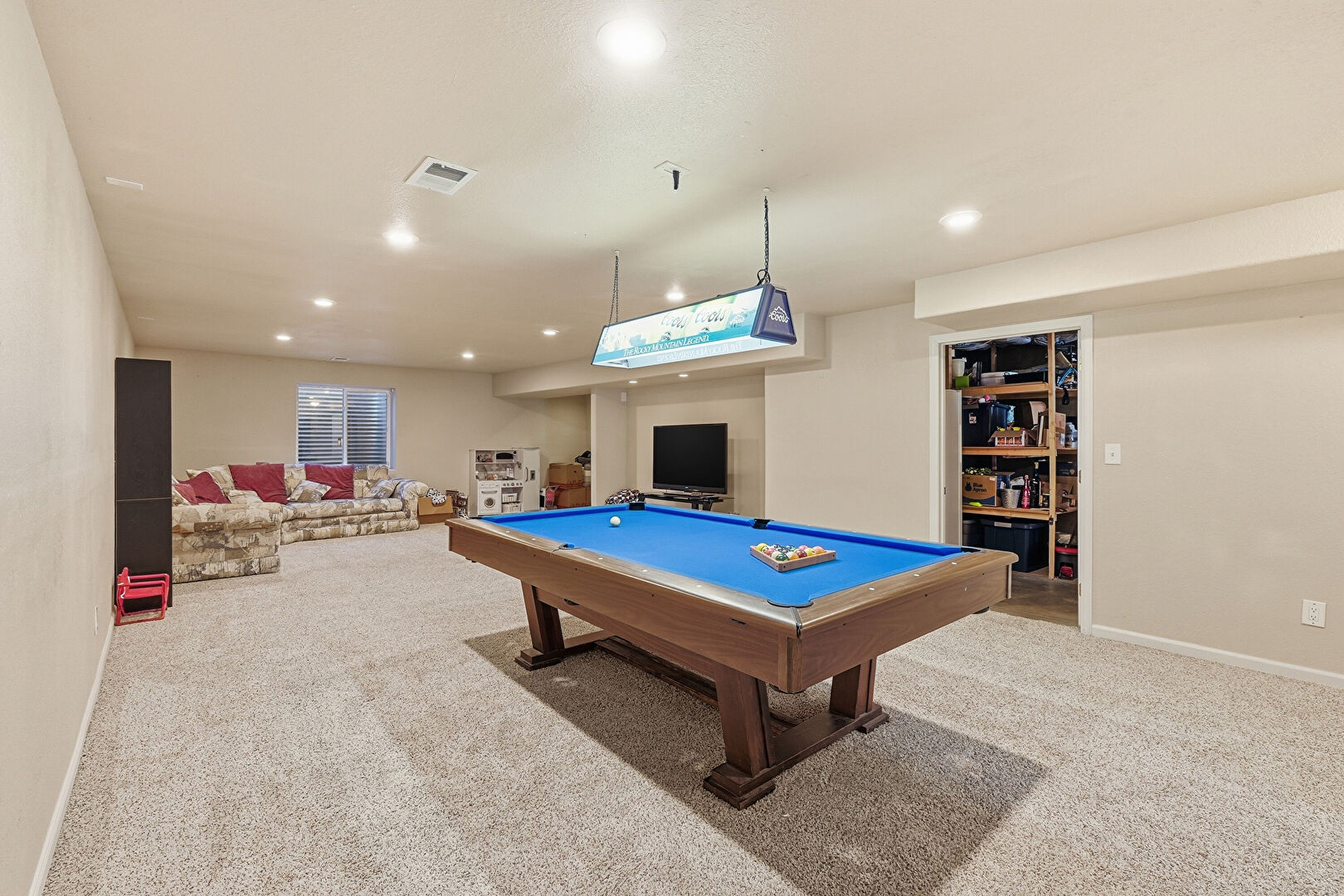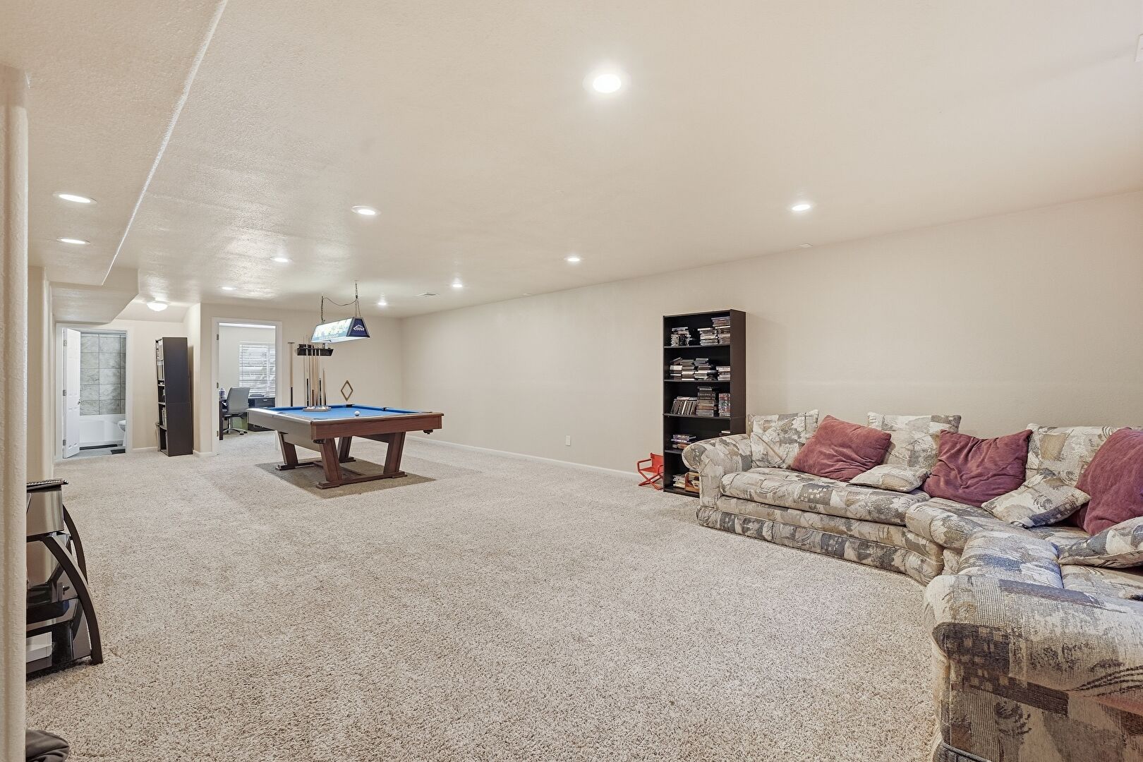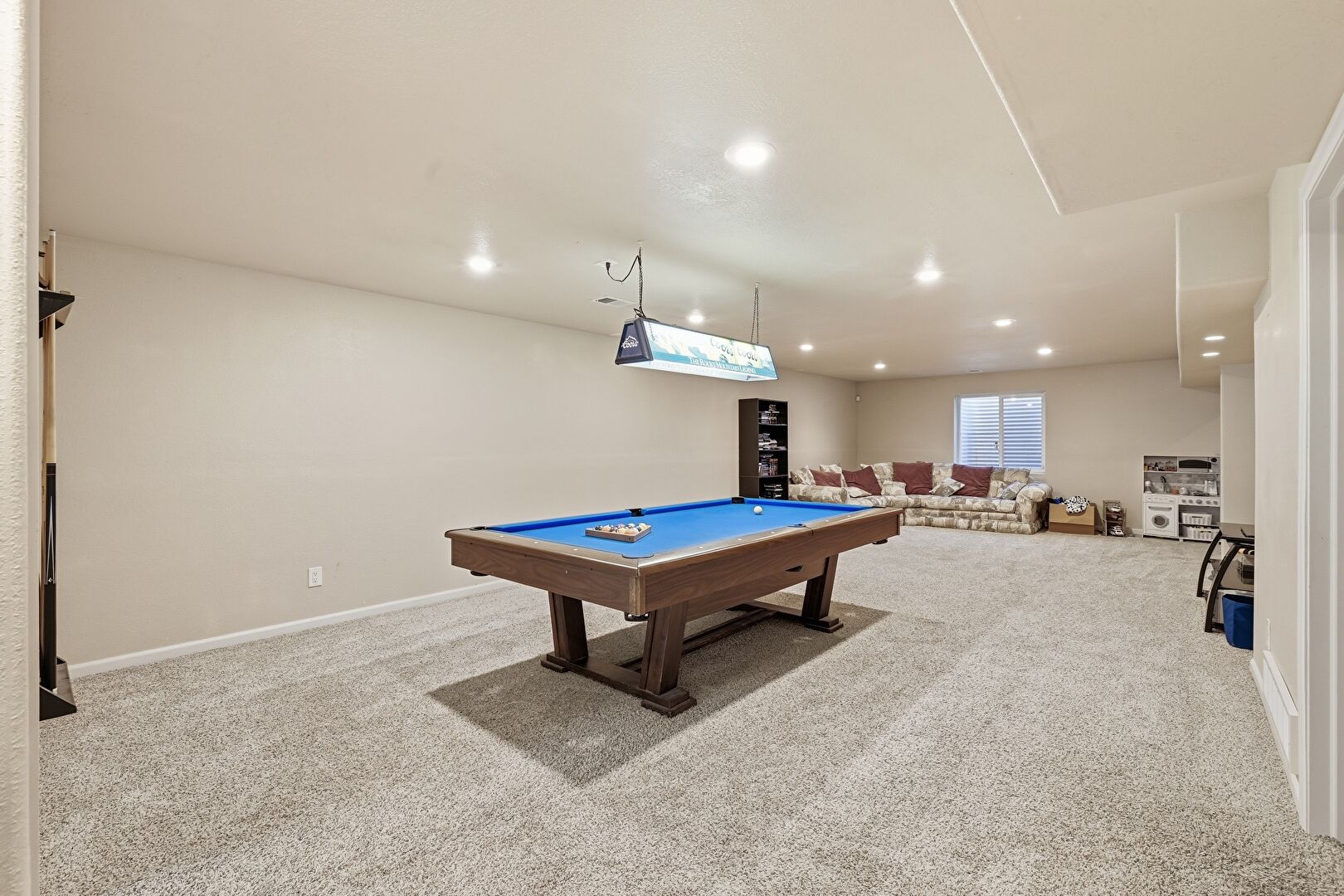 Baseboards Wall, Basement, Billiards, Carpet, Drywall, Natural Light, Recessed Lighting, Vent, Billiards, Carpet, Drywall