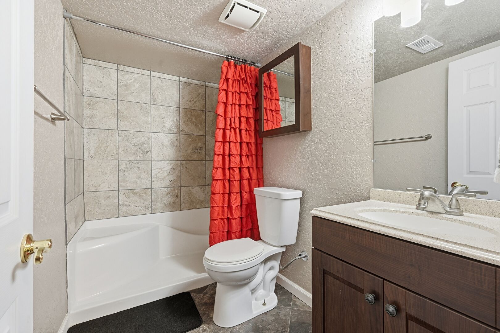 Combined Bath Shower, Full Bathroom, Textured Ceiling, Textured Wall, Tile Floor, Vanity, Vent, Baseboards Wall