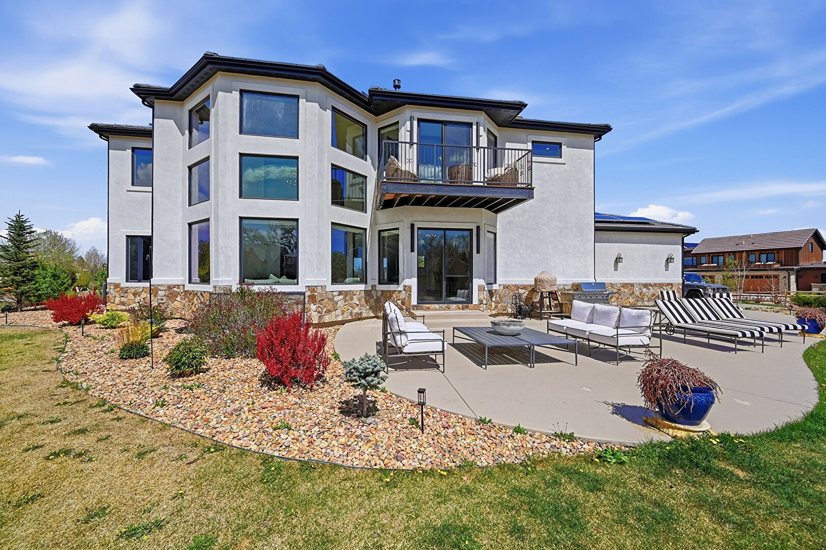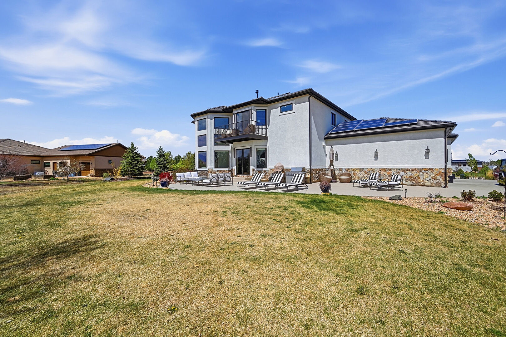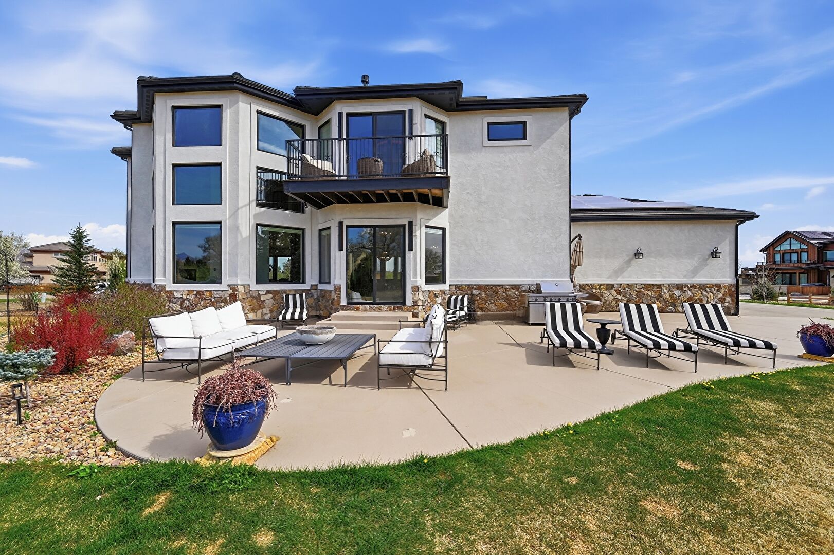 Balcony, Downspout, Glass Siding, Grill, Gutters, Lawn, Outdoor Living Space, Patio, Residential View, Solar Panels, Stone Siding, Stucco Siding, Balcony, Lawn, Outdoor Living Space