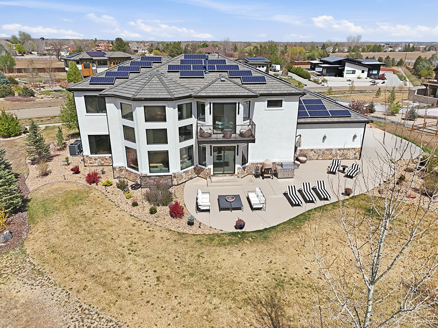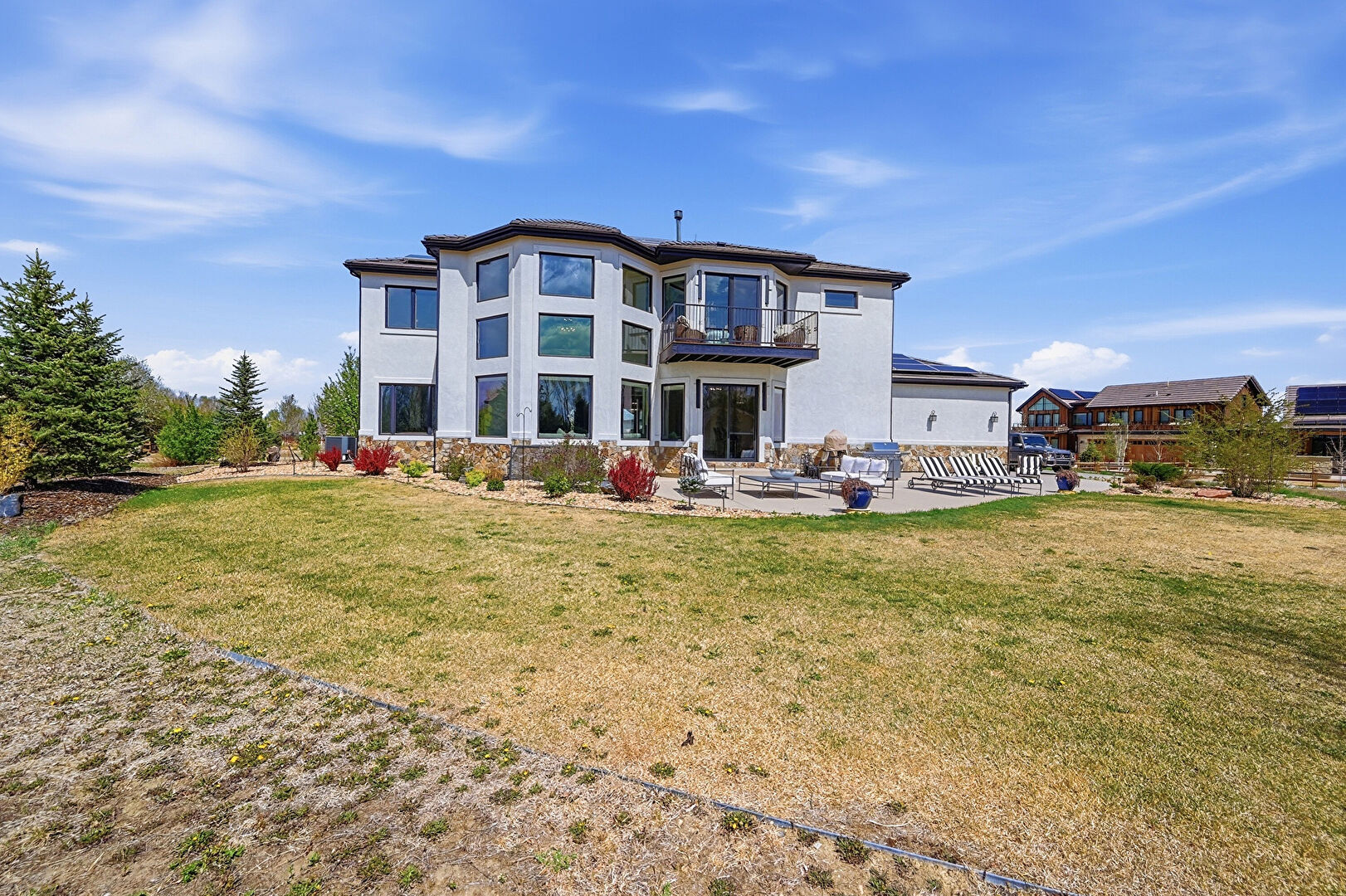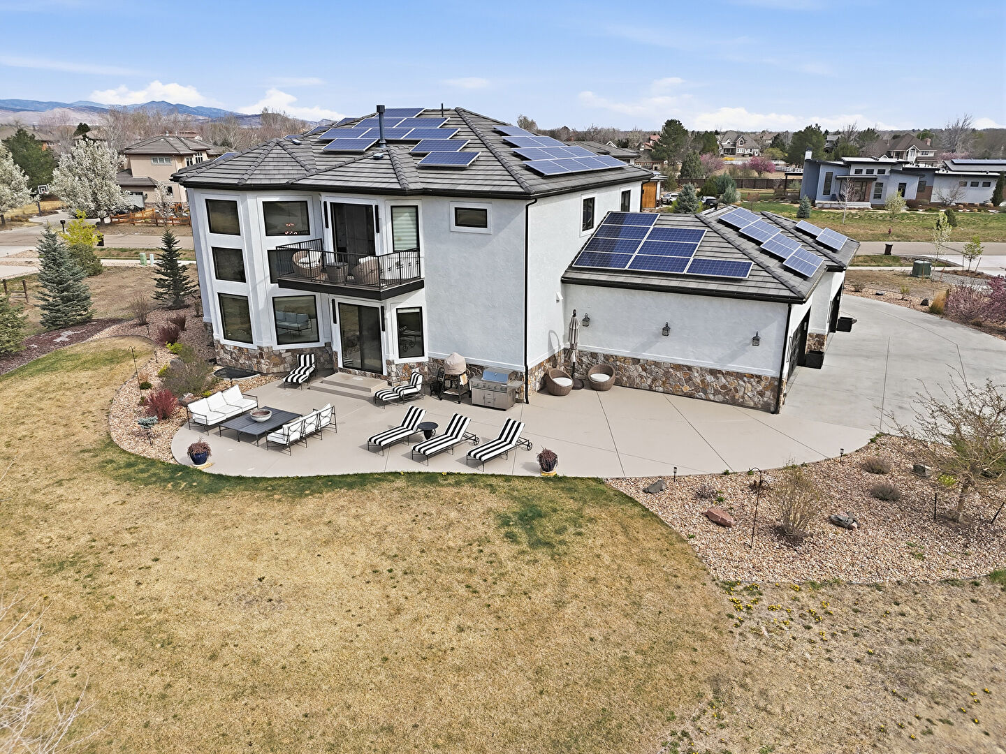 Balcony, Downspout, Glass Siding, Grill, Gutters, Lawn, Outdoor Living Space, Patio, Residential View, Solar Panels, Stone Siding, Stucco Siding, Balcony, Lawn, Outdoor Living Space
