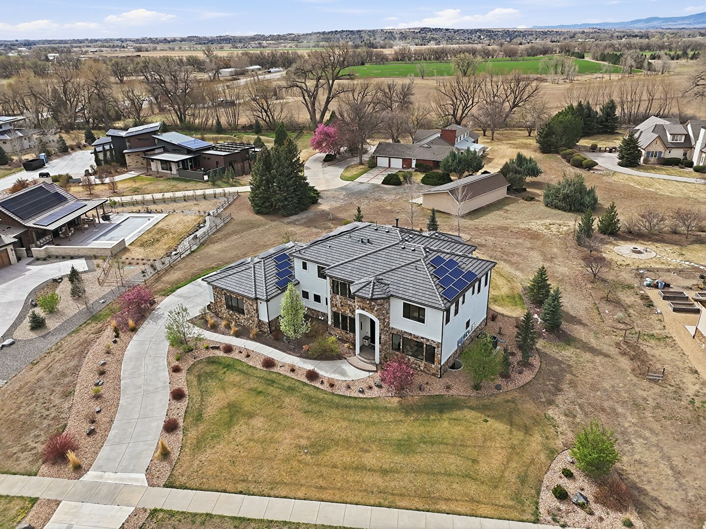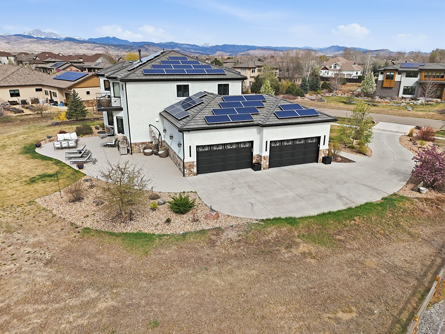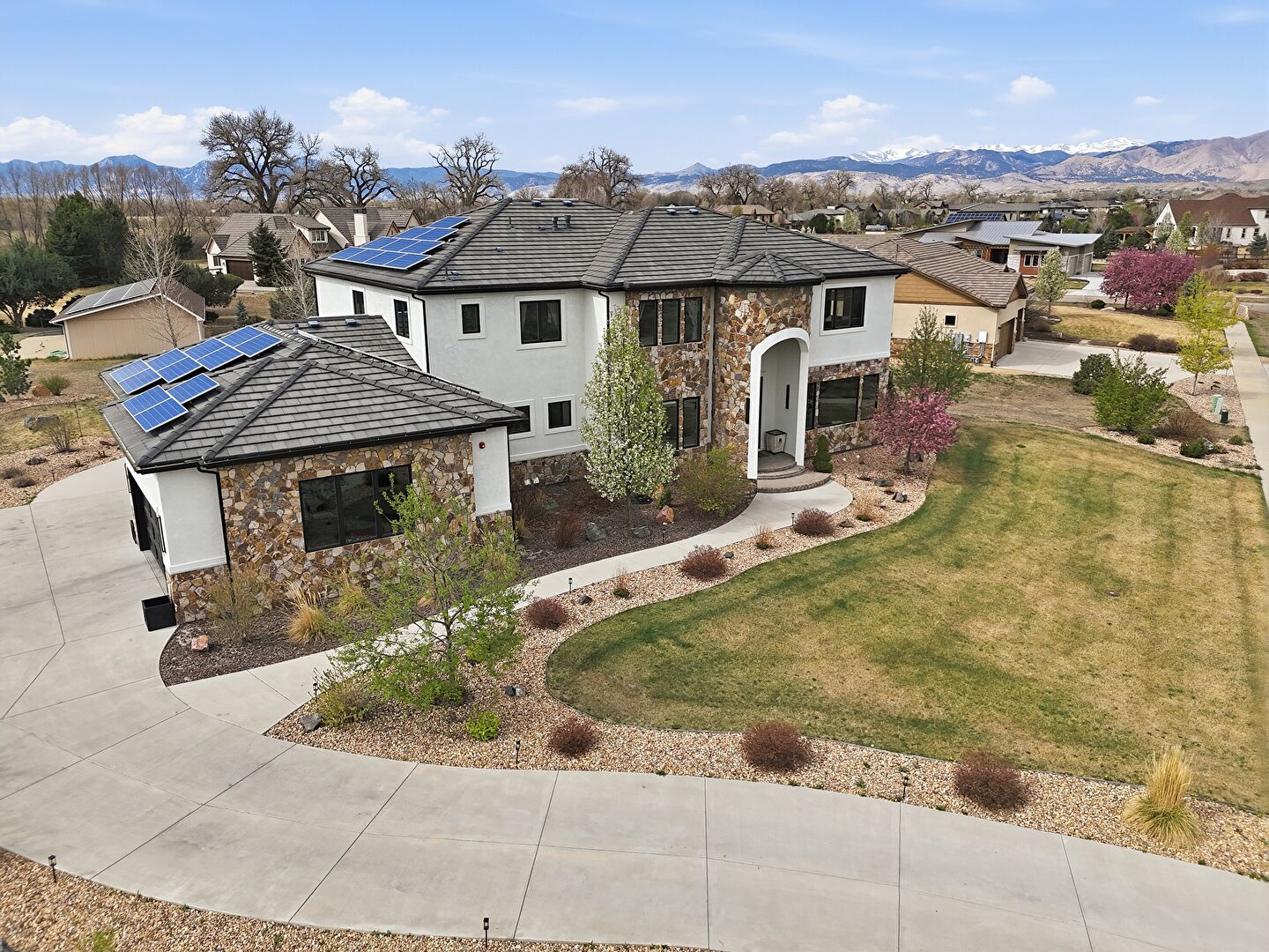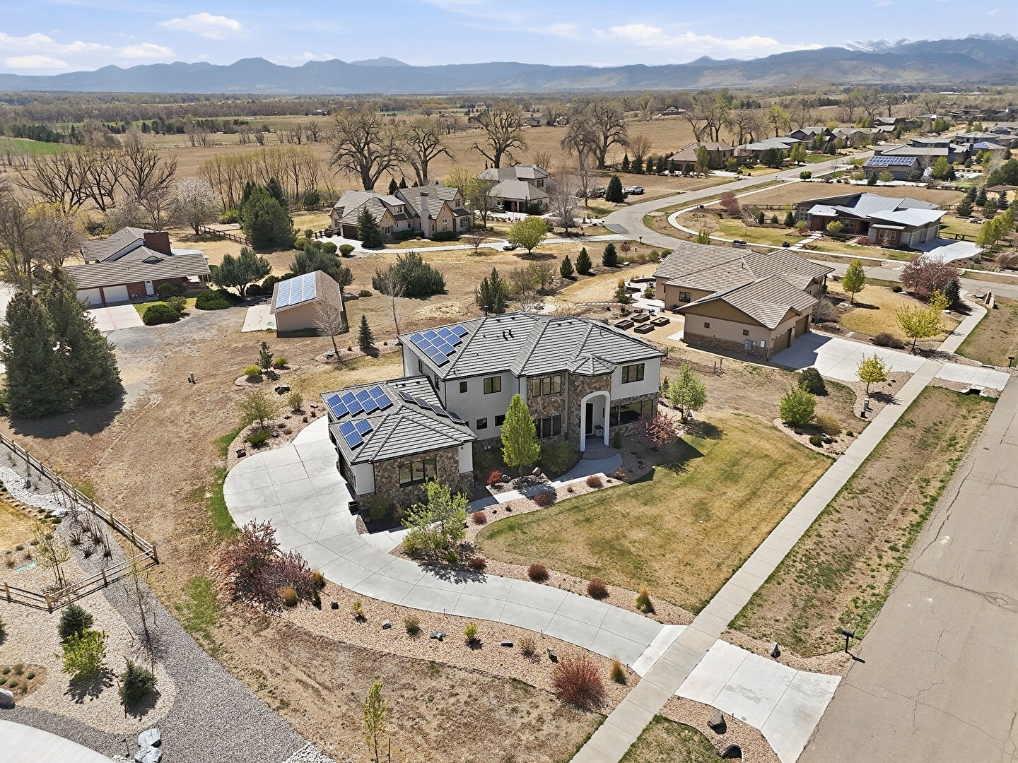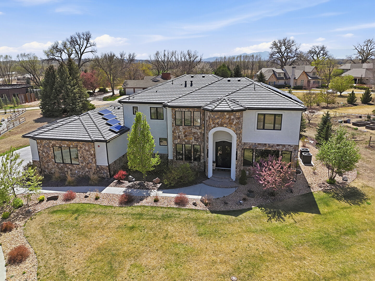 Balcony, Central Ac, Downspout, Driveway, Fence, Gutters, Lawn, Mountain View, Patio, Residential View, Rural View, Solar Panels, Stone Siding, Stoop, Stucco Siding, Tile Roof, Balcony, Central Ac, Downspout, Gutters, Mountain View, Patio, Residential View, Rural View, Stone Siding
