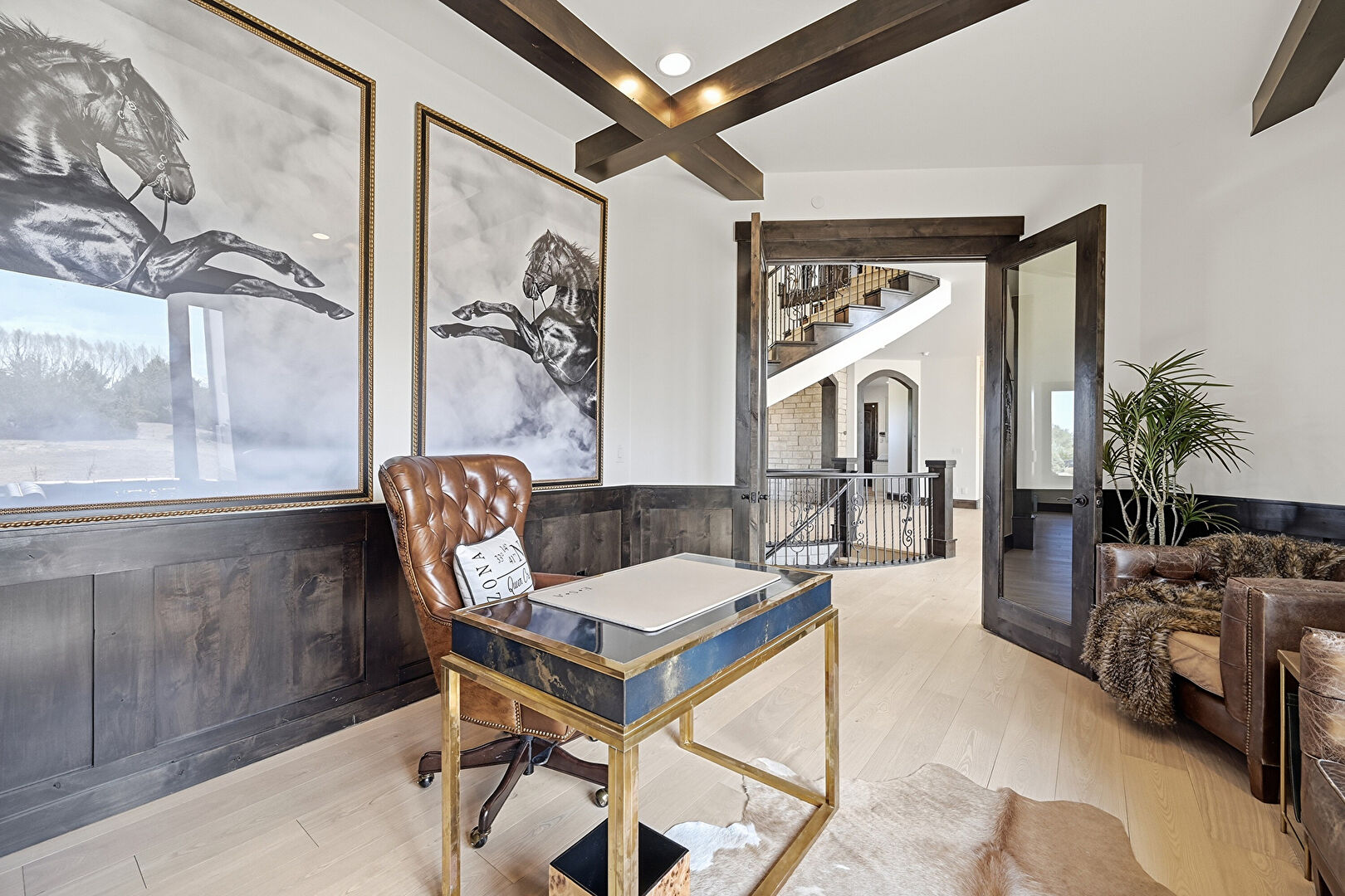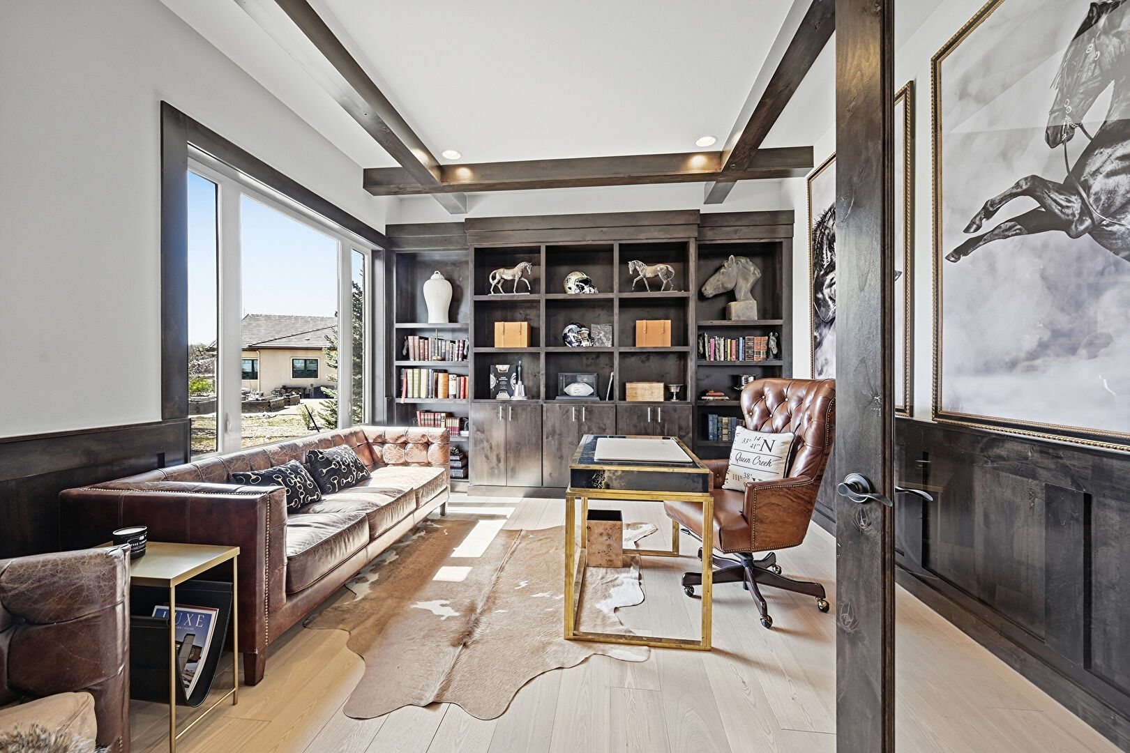 Arched Walkways, Beamed Ceiling, Built In Shelves, Coffered Ceiling, Drywall, Natural Light, Office Area, Recessed Lighting, Wainscot Wall, Wood Finish Floor, Wood Wall, Drywall, Office Area