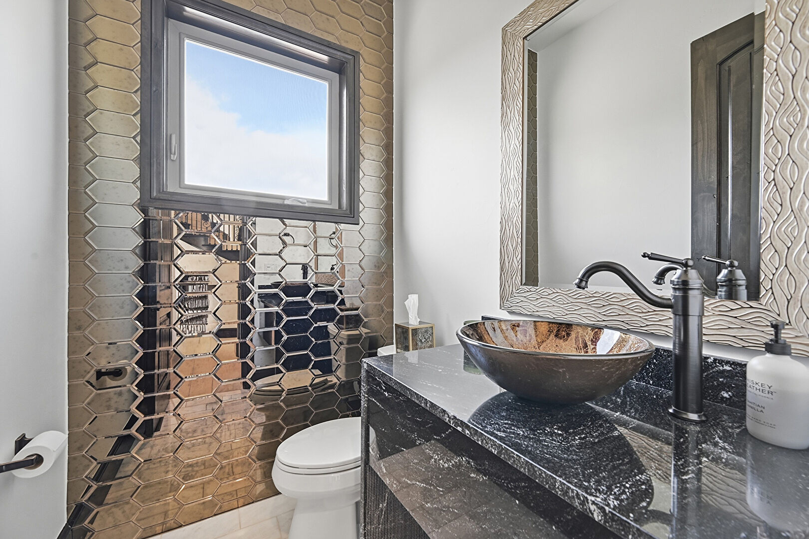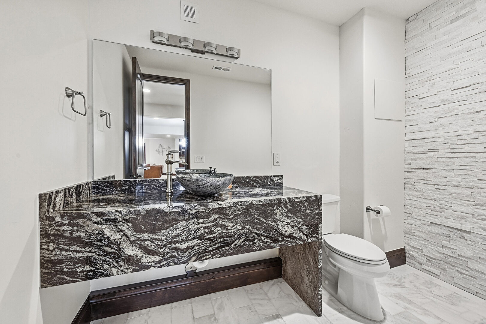 Half Bathroom, Marble Finish Floor, Stone Wall, Vanity, Vent, Drywall