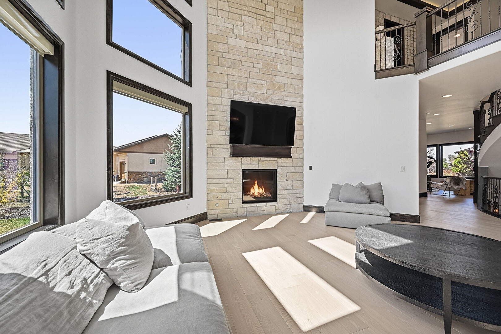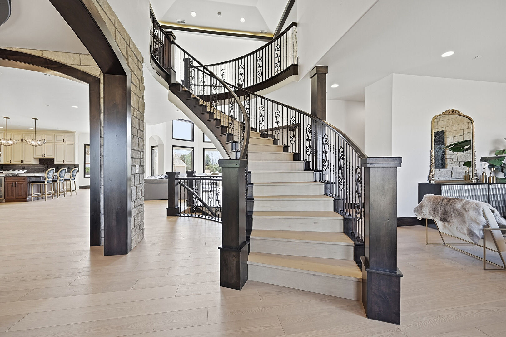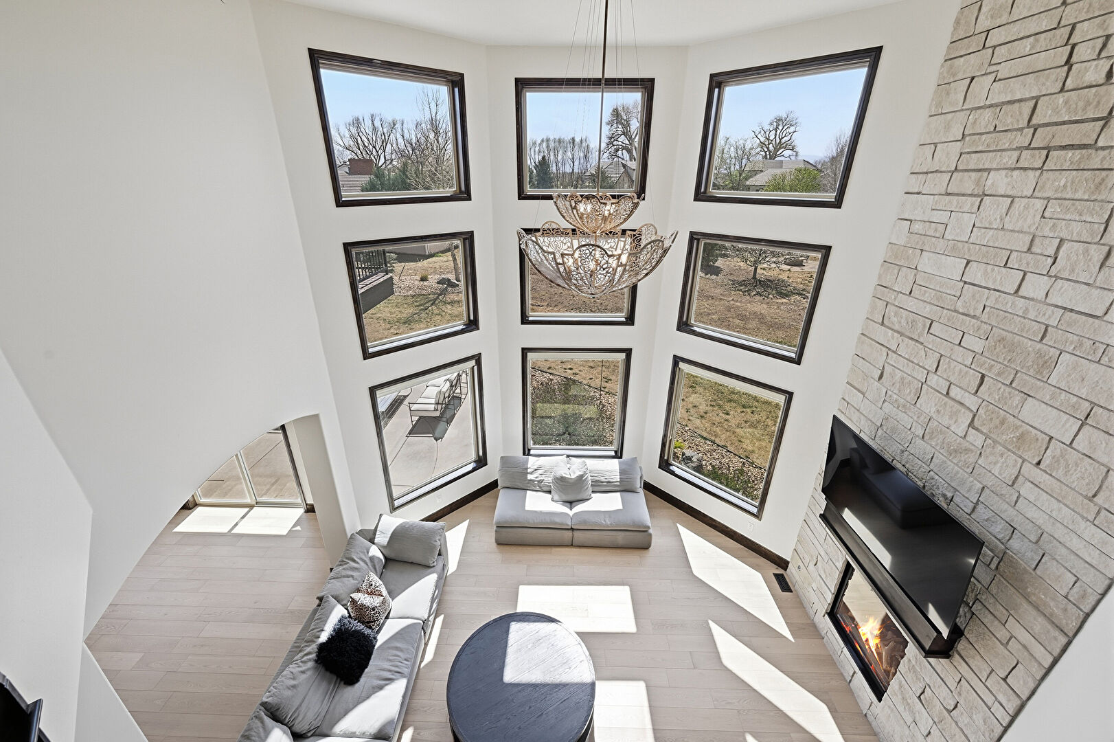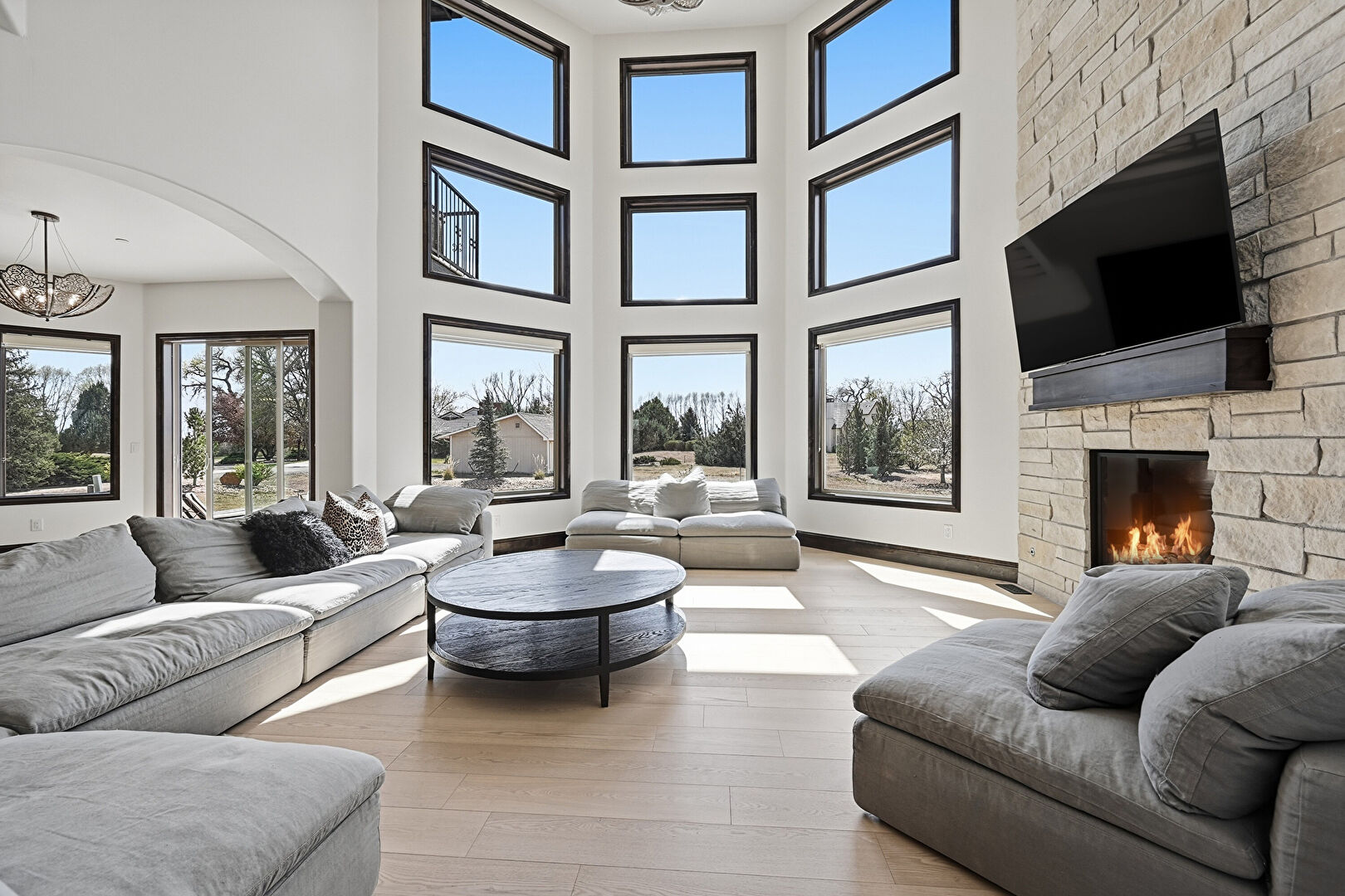 Arched Walkways, Baseboards Wall, Drywall, Fireplace, High Ceiling, Natural Light, Notable Chandelier, Recessed Lighting, Stairs, Stone Wall, Wood Finish Floor, Arched Walkways, Baseboards Wall, Fireplace, Notable Chandelier