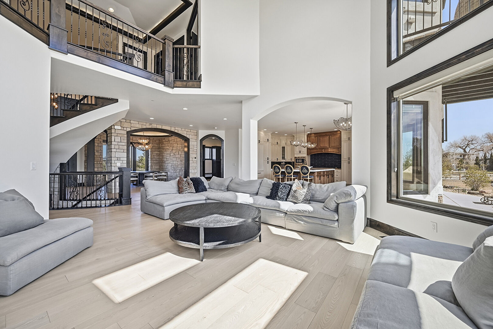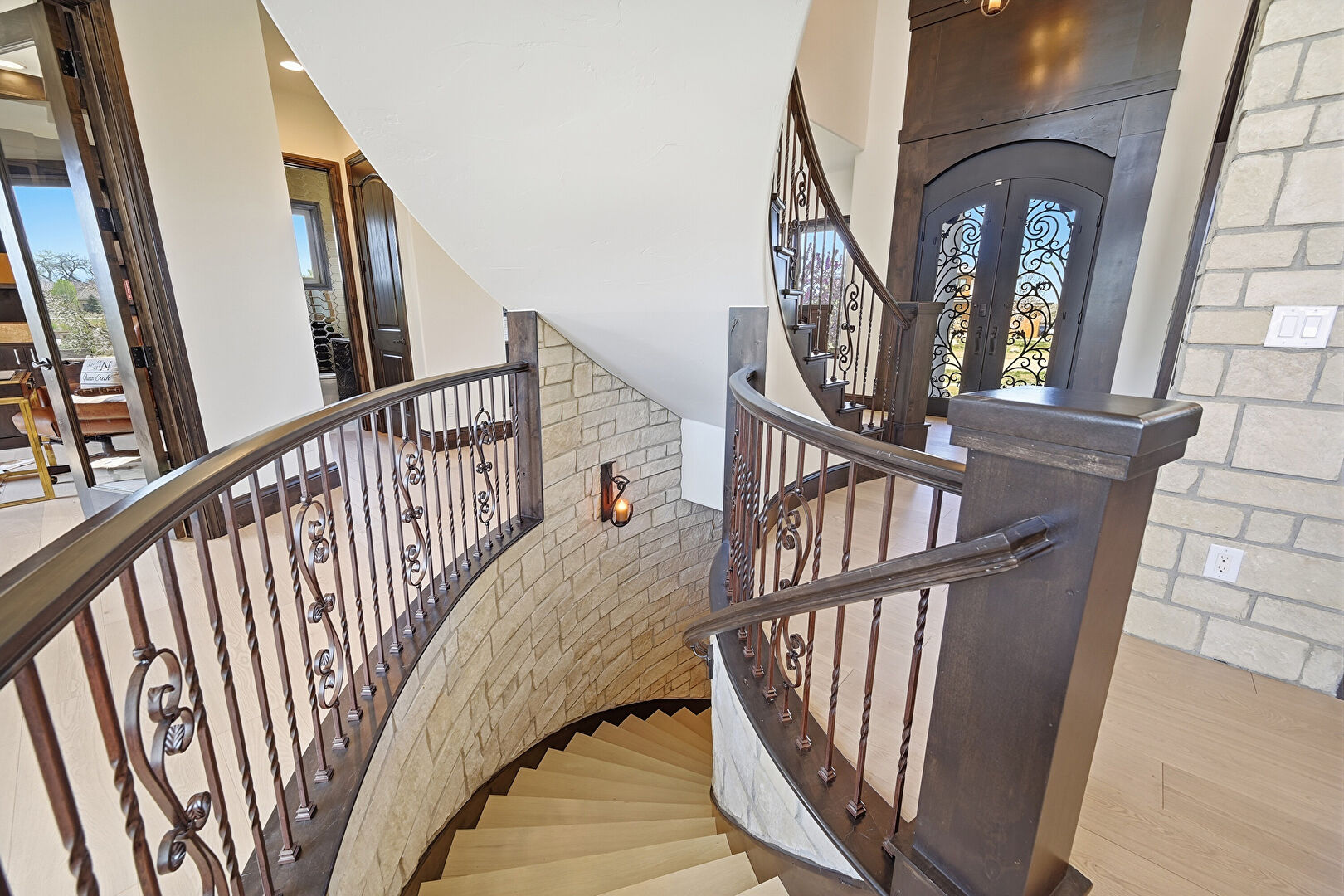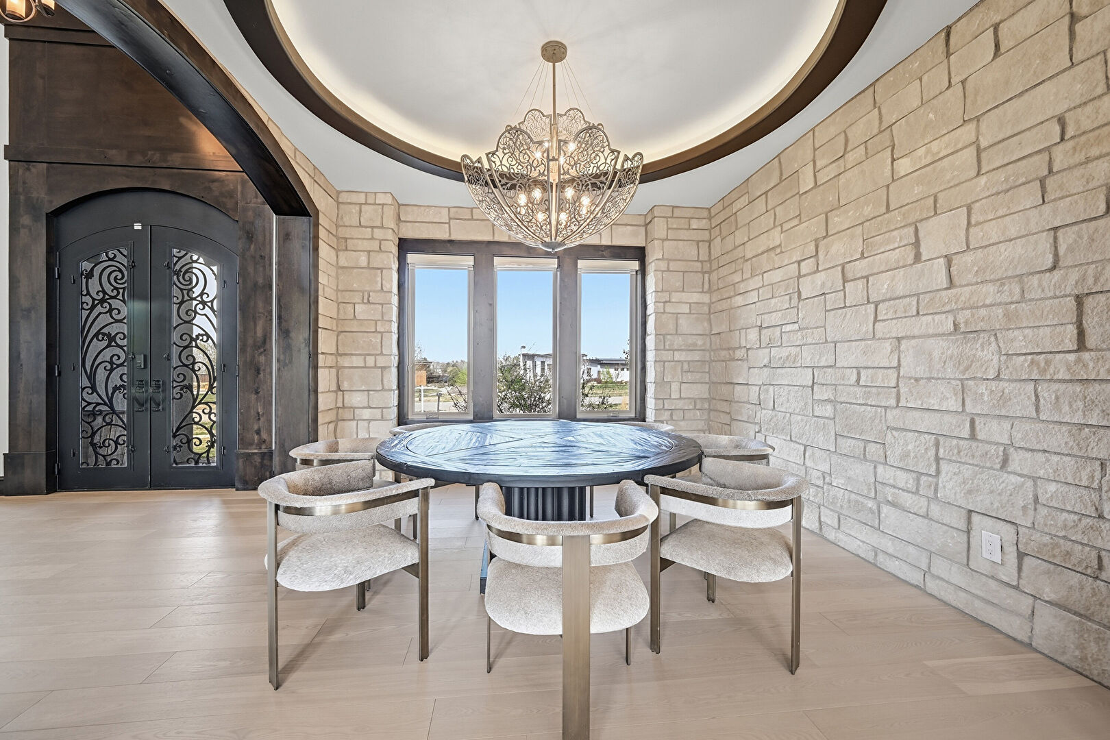 Arched Walkways, French Doors, Natural Light, Notable Chandelier, Tray Ceiling, Wood Finish Floor, Stone Wall